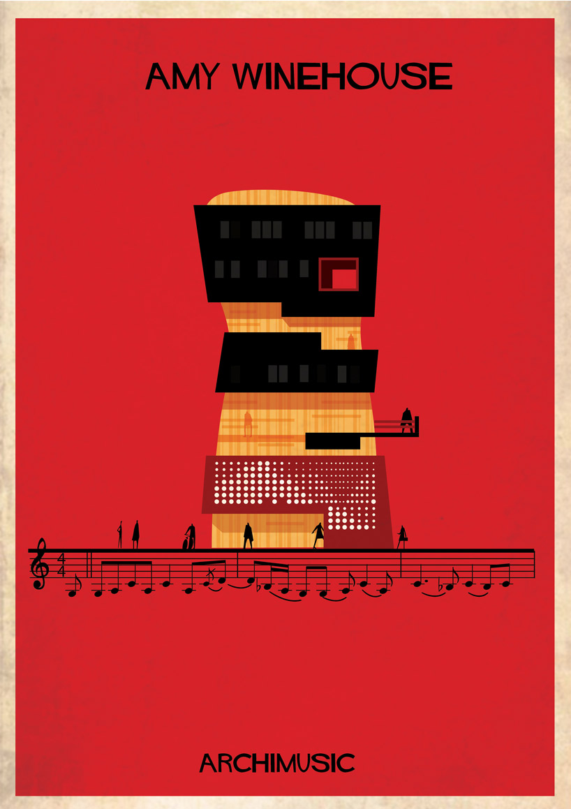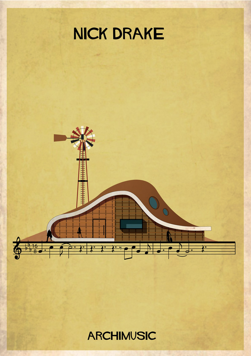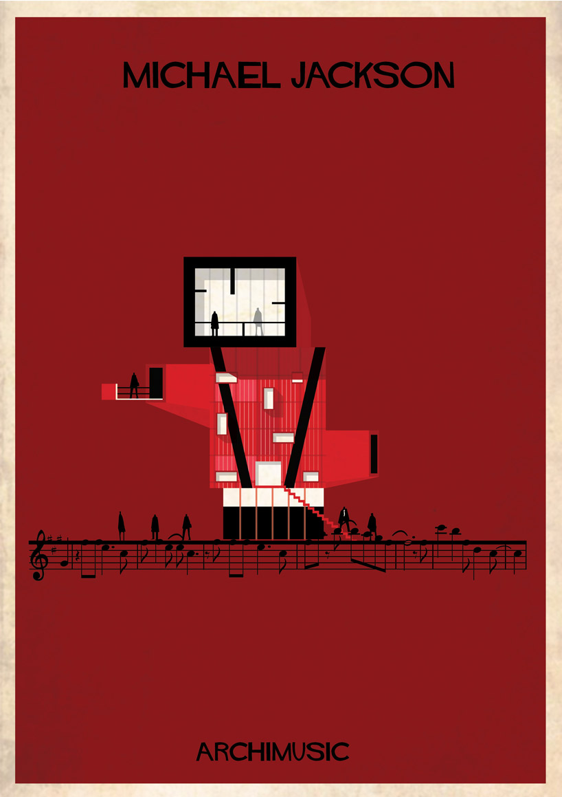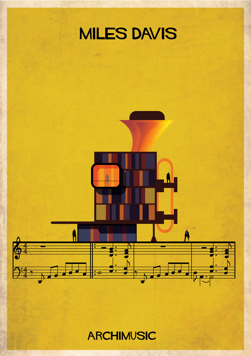 Lorsque des artistes ou des groupes ont tellement apporté à la musique qu’il serait normal de les considérer comme les architectes de leur genre musical. Que se soit le jazz avec Miles Davis ou Chet Baker, le rock avec Elvis ou Radiohead, le grunge avec Nirvana, la pop avec les Beatles ou Blur. Et l’architecte et illustrateur Federico Babina, habitué à mélanger ces deux arts, a la bonne idée d’associer musique et architecture dans sa nouvelle série graphique ARCHIMUSIC. 27 grands génies de la musique sont alors retranscrits en bâtiments architecturaux inspirés de leurs caractéristiques qui ont fait d’eux des icônes.