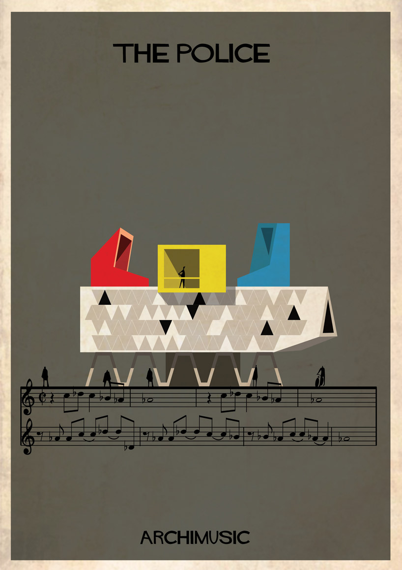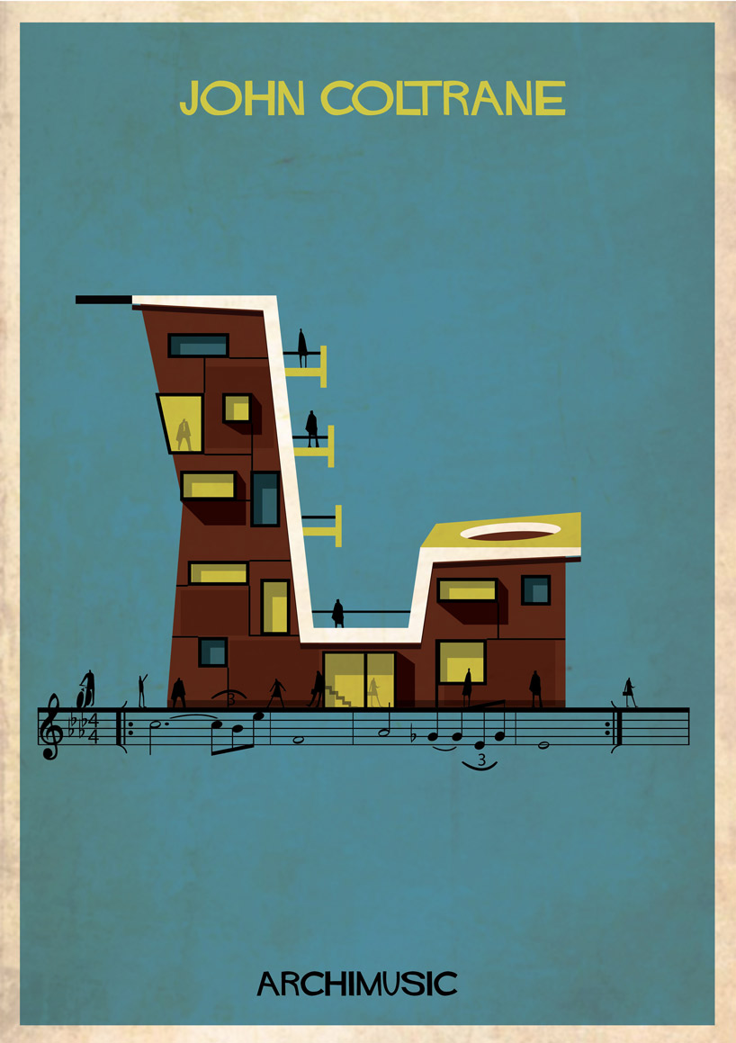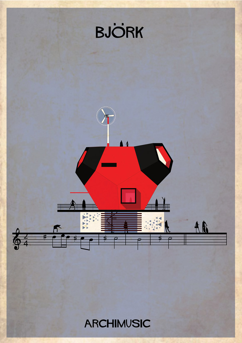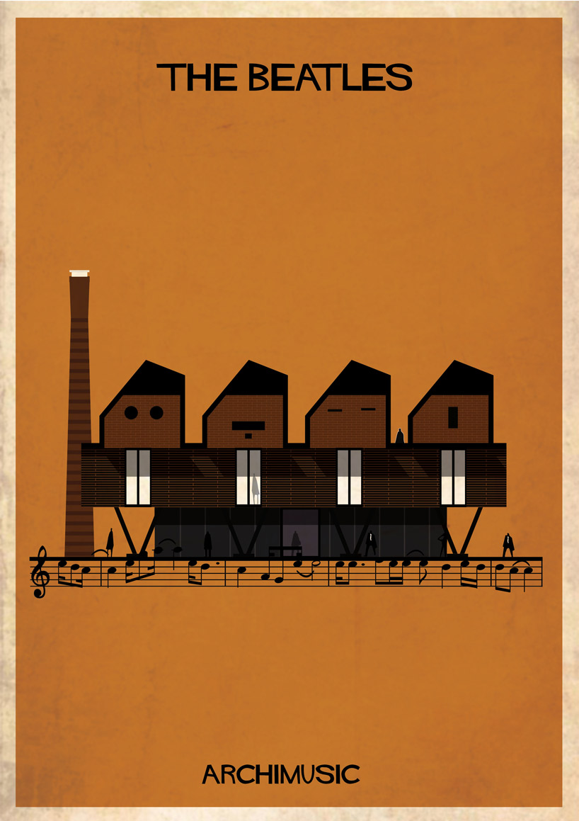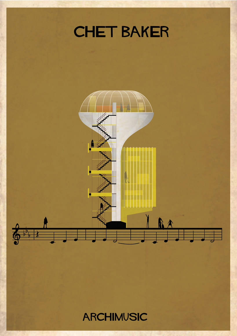 Lorsque des artistes ou des groupes ont tellement apporté à la musique qu’il serait normal de les considérer comme les architectes de leur genre musical. Que se soit le jazz avec Miles Davis ou Chet Baker, le rock avec Elvis ou Radiohead, le grunge avec Nirvana, la pop avec les Beatles ou Blur. Et l’architecte et illustrateur Federico Babina, habitué à mélanger ces deux arts, a la bonne idée d’associer musique et architecture dans sa nouvelle série graphique ARCHIMUSIC. 27 grands génies de la musique sont alors retranscrits en bâtiments architecturaux inspirés de leurs caractéristiques qui ont fait d’eux des icônes.