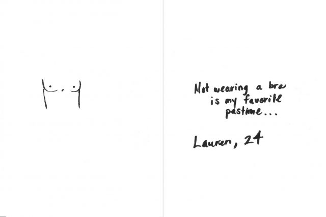 Le magazine à demandé 57 femmes, de 17 à 72 ans, rencontrées au hasard dans les rues de New York quel était leur ressenti vis à vis de leurs seins. Chacune les a dessinés, accompagnés d’une petite phrase.