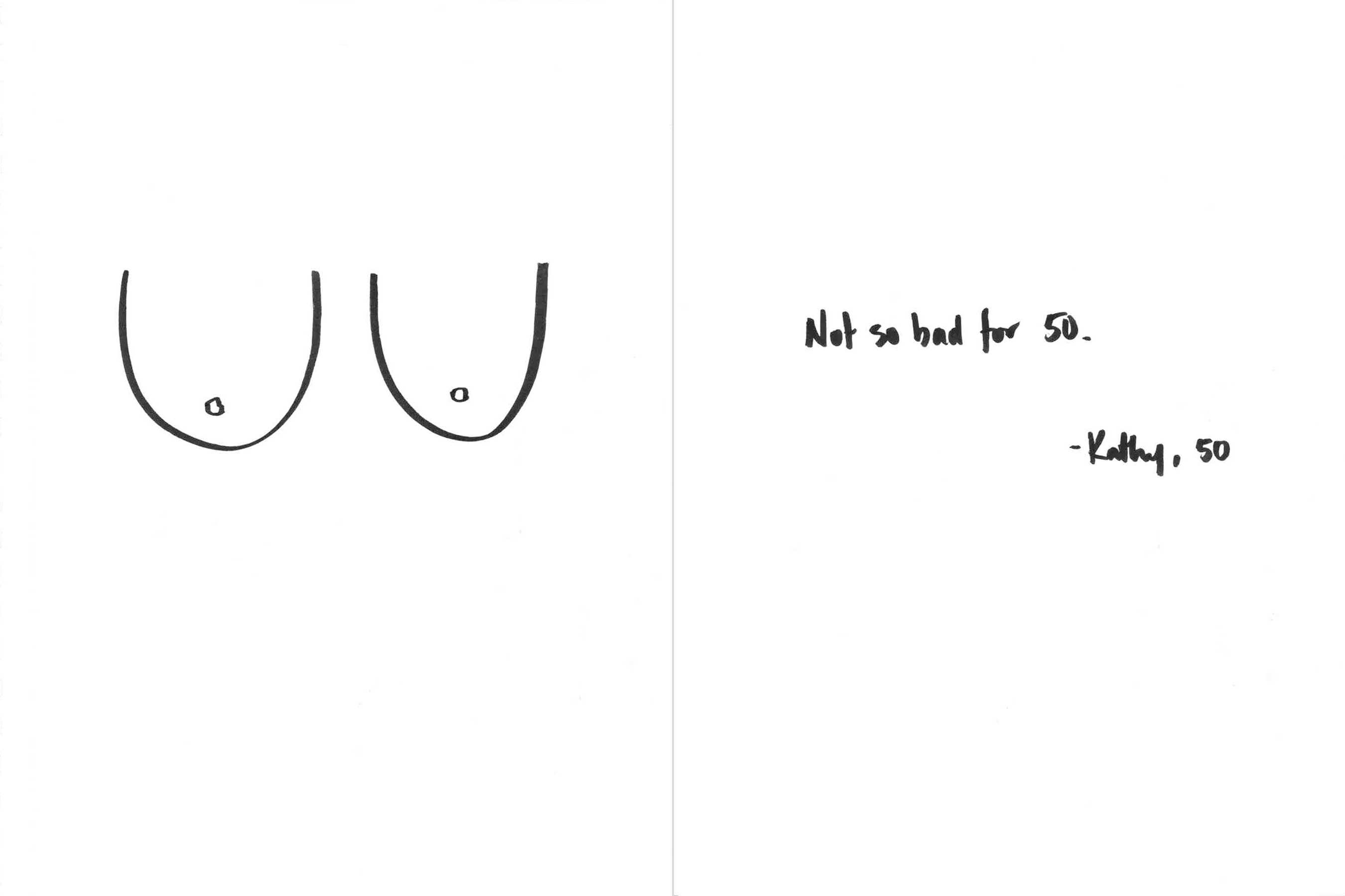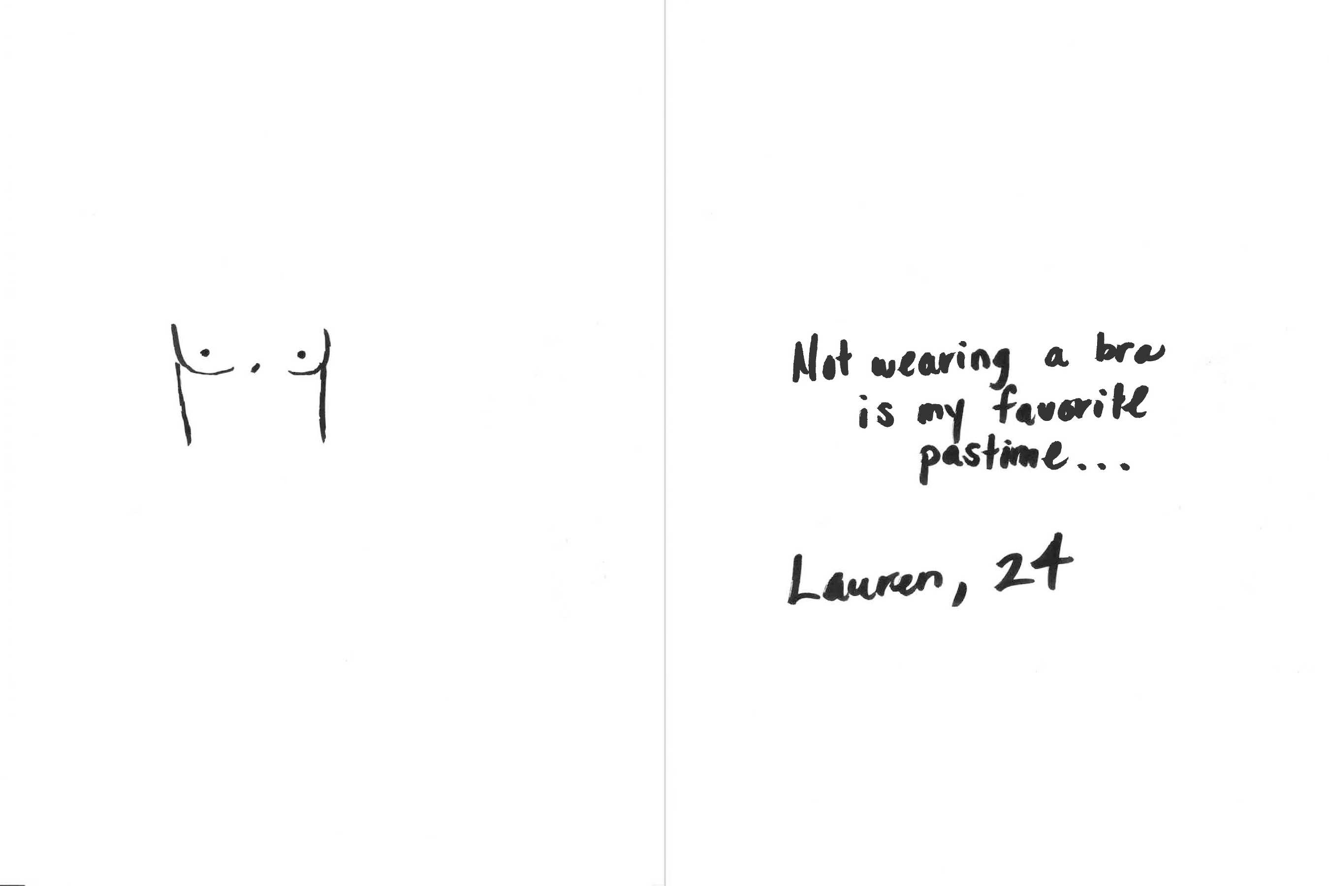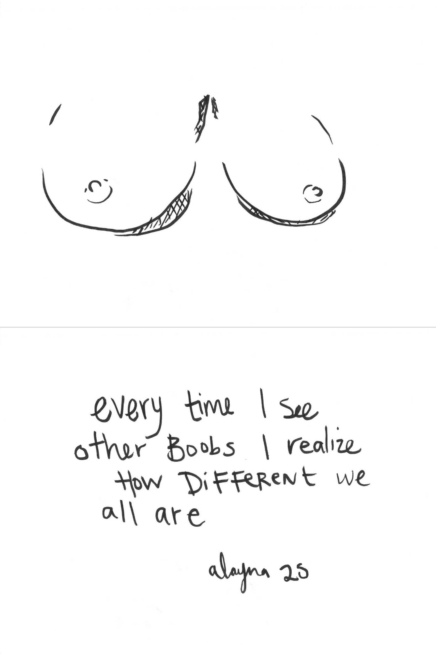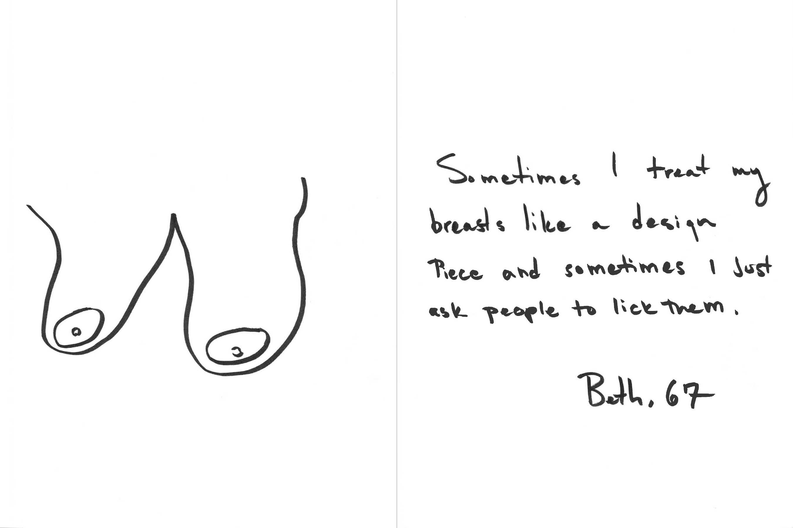 Le magazine à demandé 57 femmes, de 17 à 72 ans, rencontrées au hasard dans les rues de New York quel était leur ressenti vis à vis de leurs seins. Chacune les a dessinés, accompagnés d’une petite phrase.