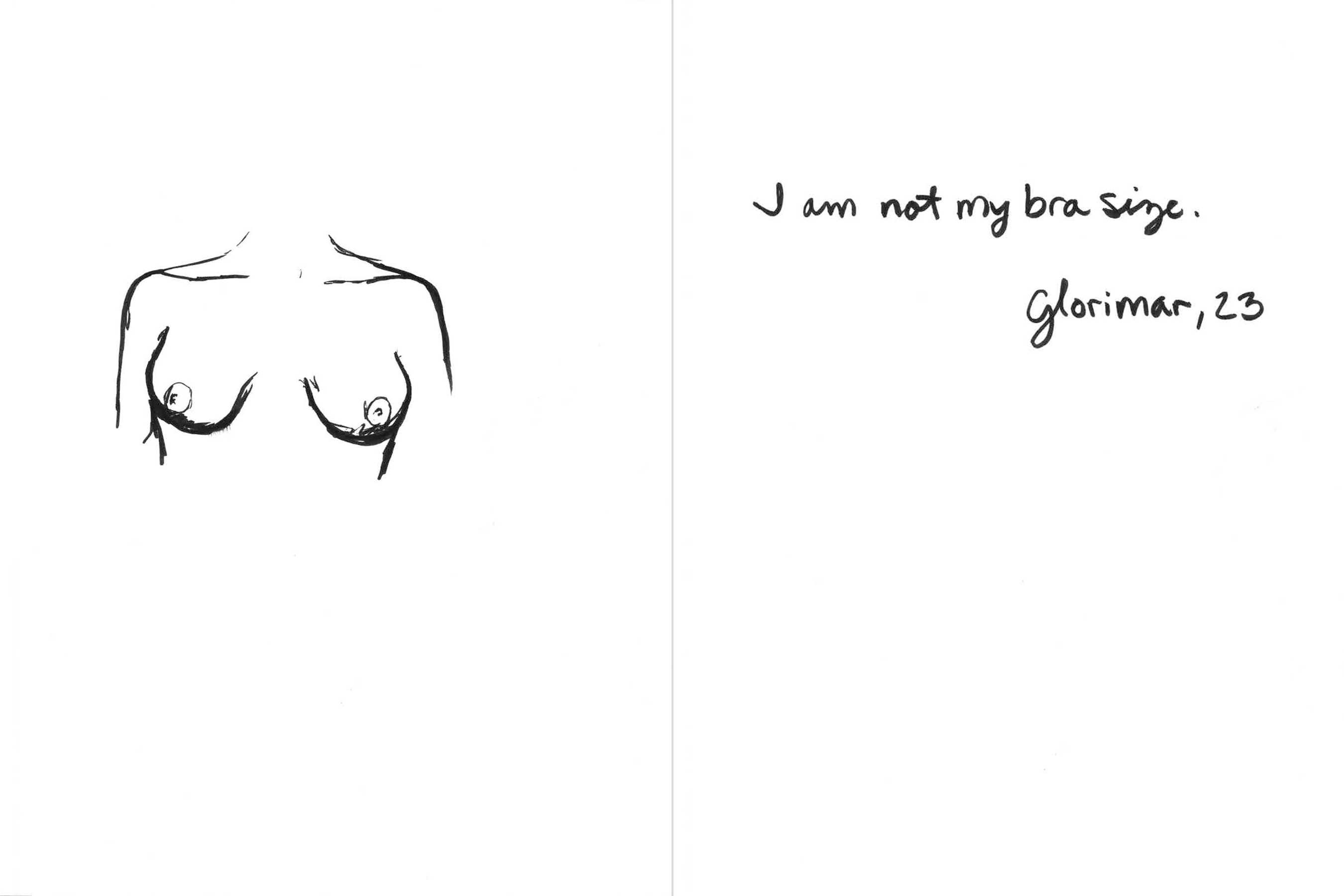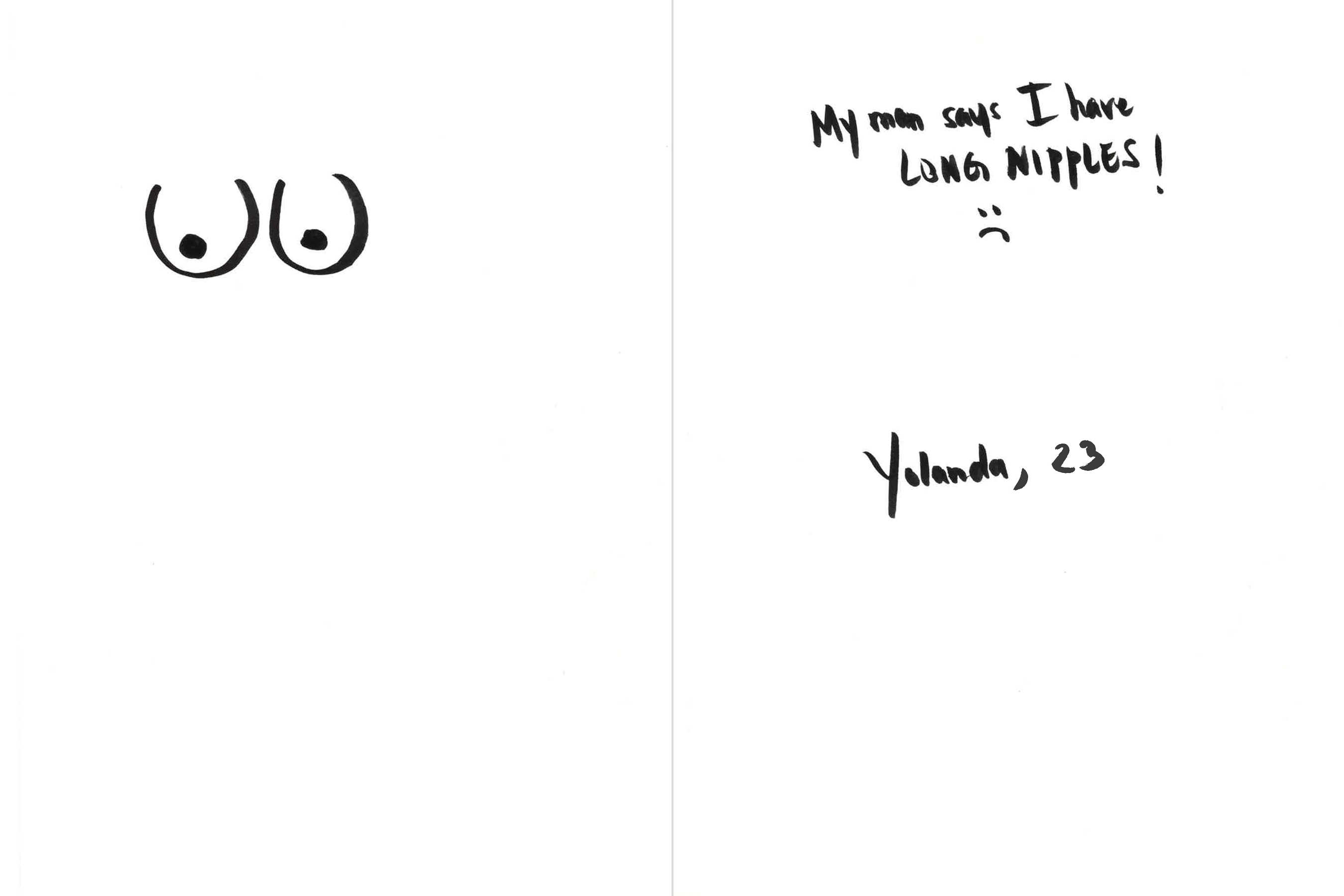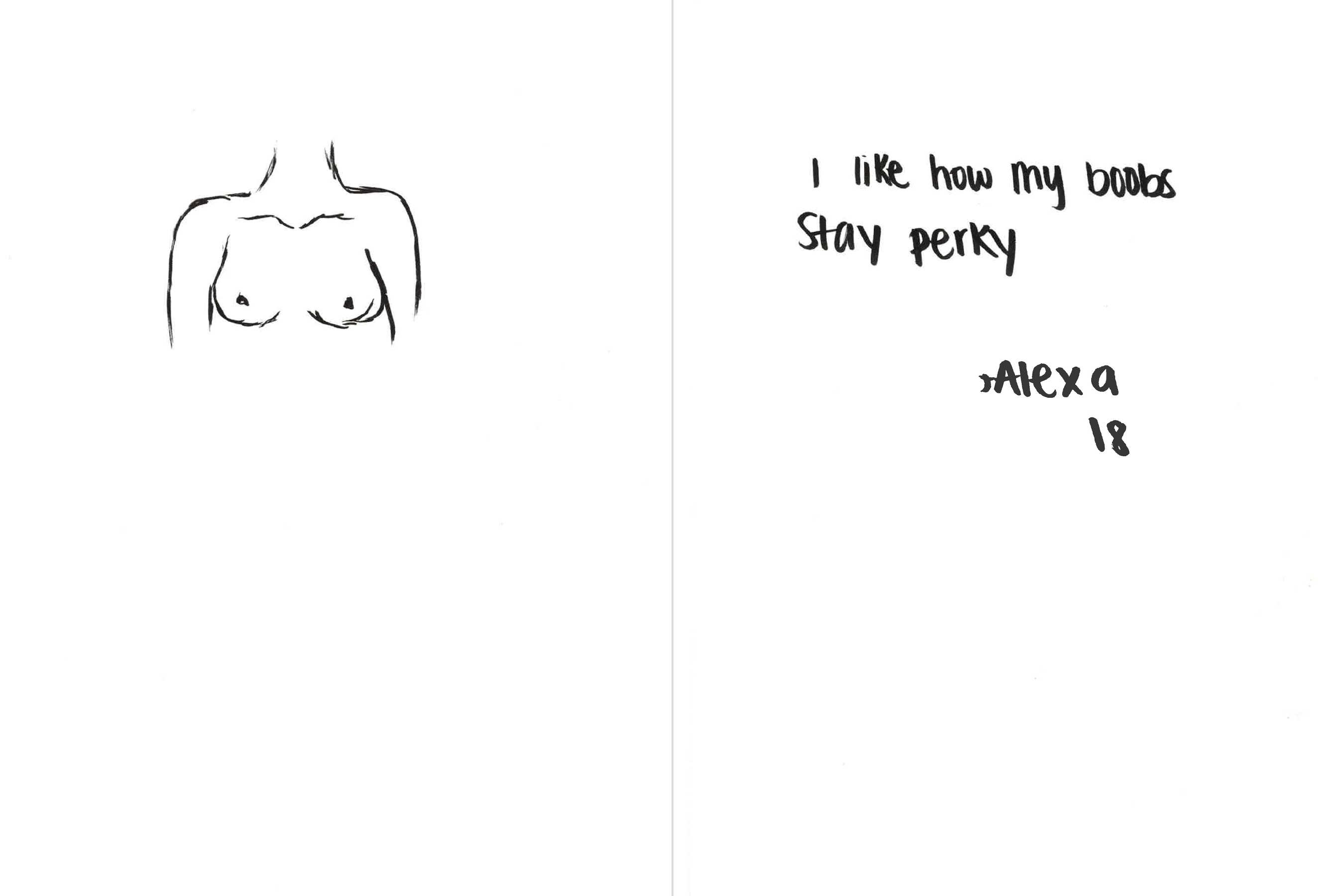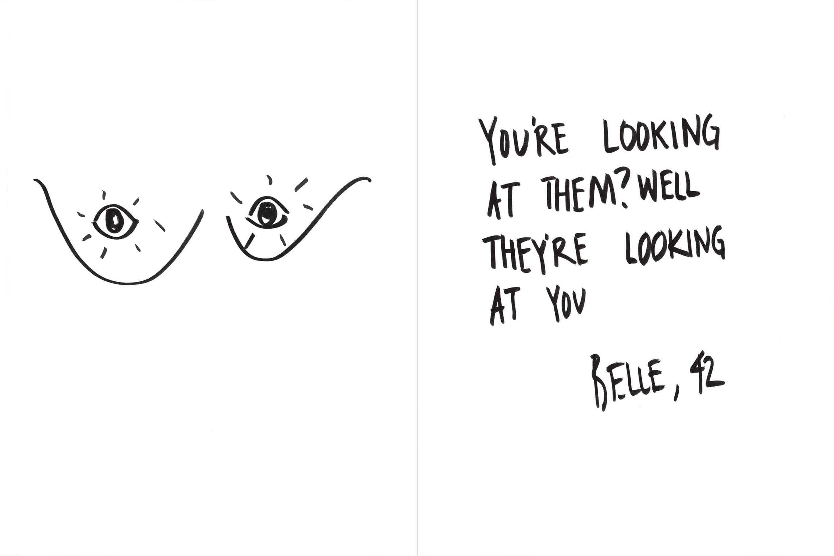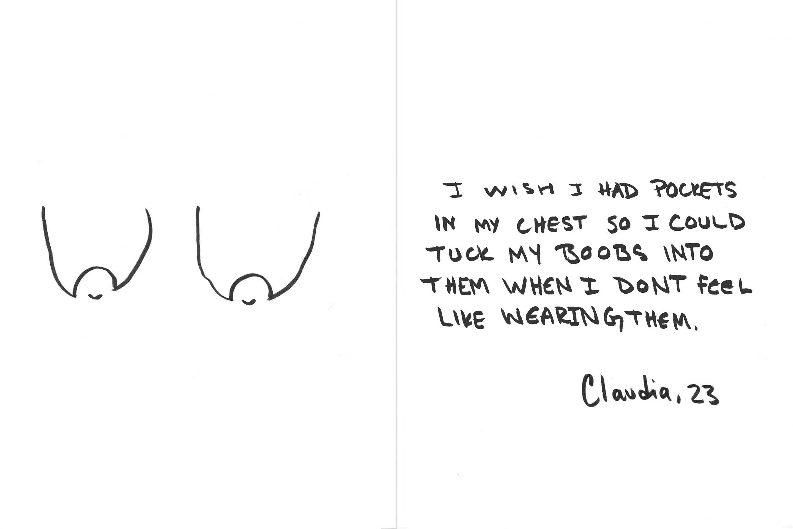Le magazine à demandé 57 femmes, de 17 à 72 ans, rencontrées au hasard dans les rues de New York quel était leur ressenti vis à vis de leurs seins. Chacune les a dessinés, accompagnés d’une petite phrase.