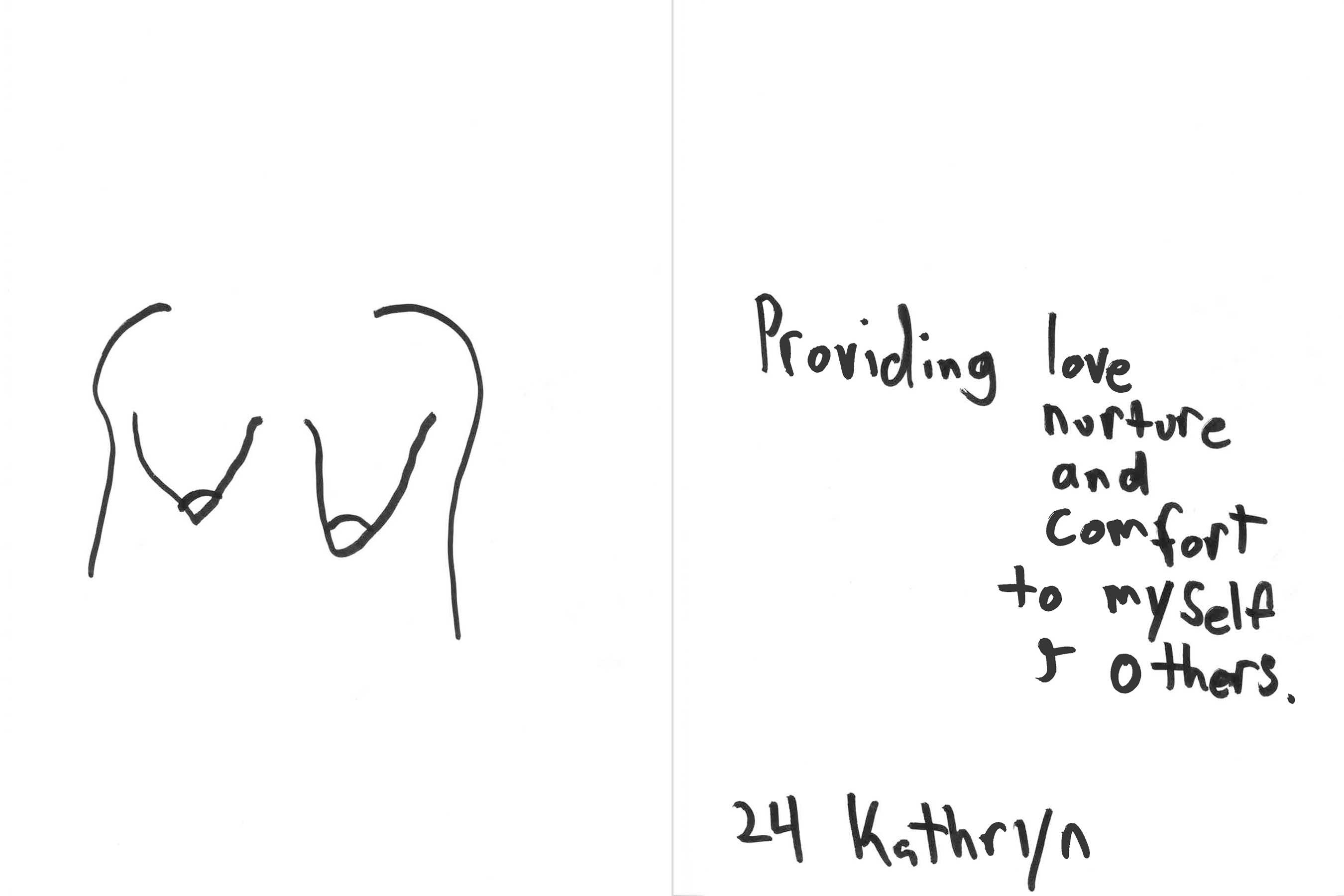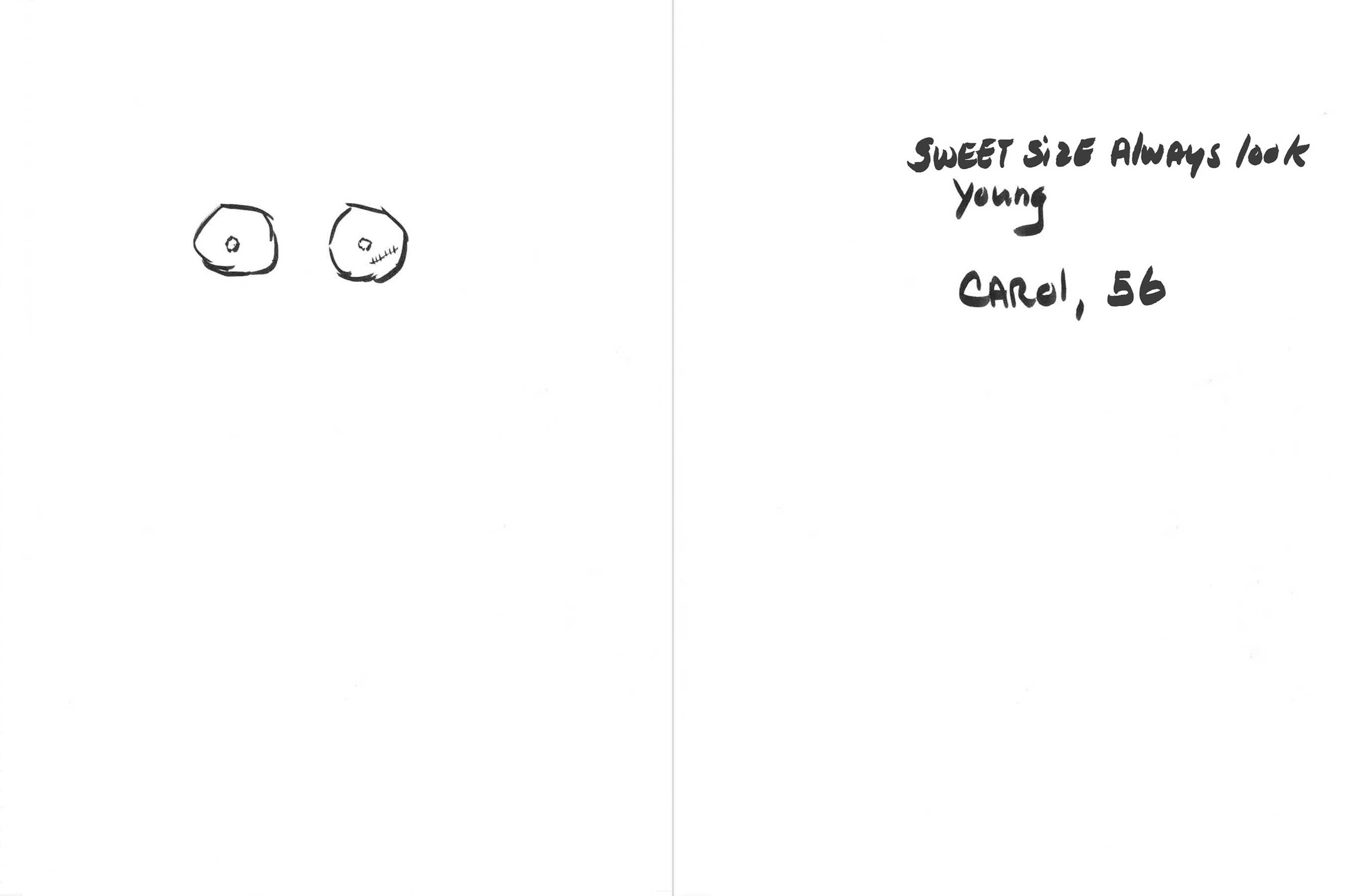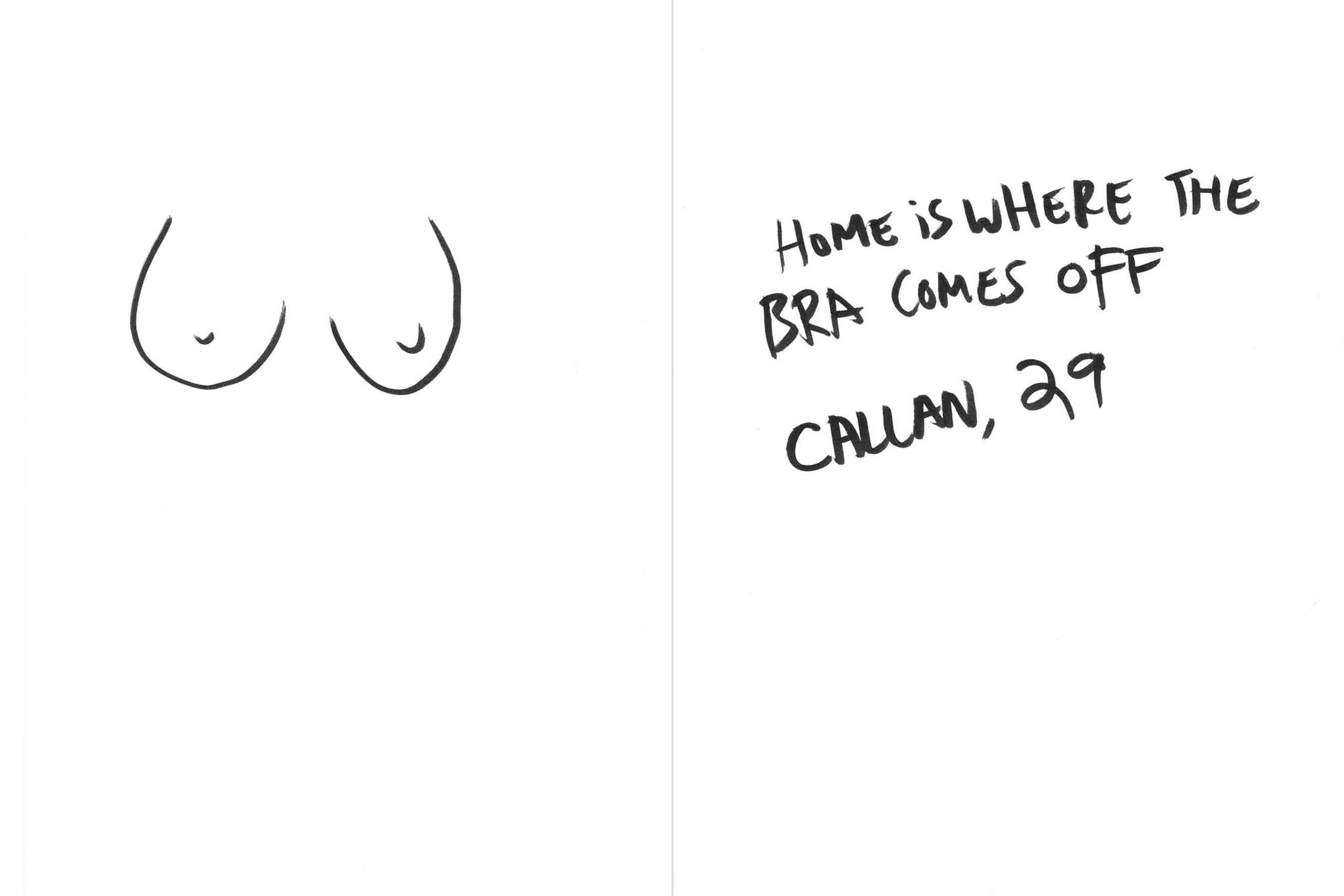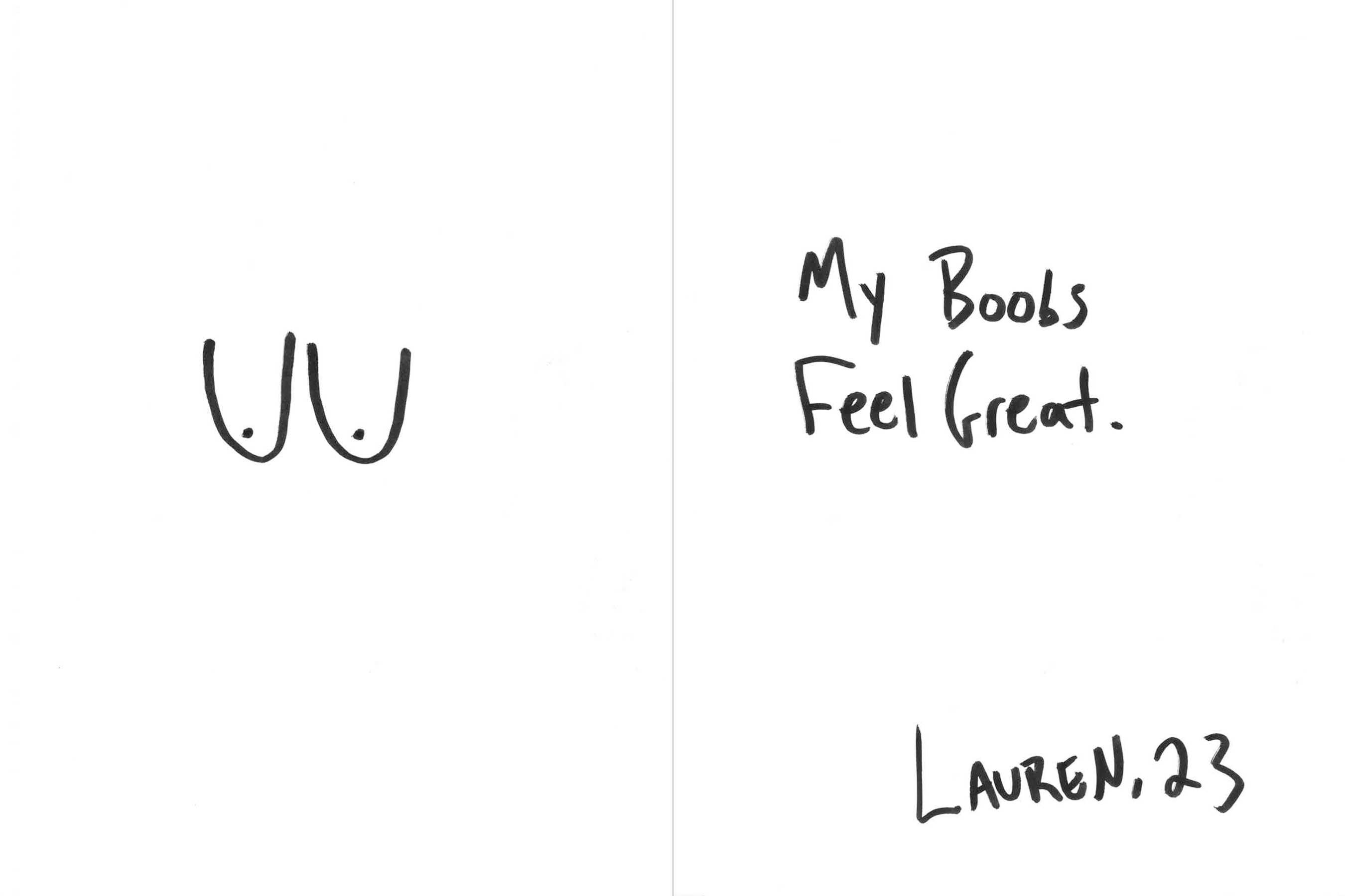 Le magazine à demandé 57 femmes, de 17 à 72 ans, rencontrées au hasard dans les rues de New York quel était leur ressenti vis à vis de leurs seins. Chacune les a dessinés, accompagnés d’une petite phrase.