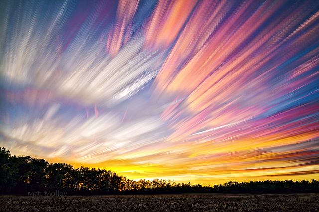 Matt Molloy est un photographe canadien, habitué à s’émerveiller du ciel sauvage de son pays. A force de le photographier sous toutes les coutures, de tous les angles et d’en faire de magnifique timelapse pour ne rien rater du moment, il eu l’idée de compiler tout ça sur une seule et même photo. Le résultat est tout simplement magnifique. Des #skyporn en veux-tu, en voilà, à rendre jaloux le plus connecté des impressionniste. Des ciels peints à la spatule ou en point grâce à une technique numérique que Matt Molloy appelle “timestack”. Ne loupez pas sa vidéo tutorial plus bas et quelques unes de ses photos à la suite.
