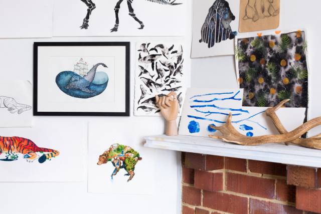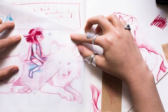 Quand Furry Little Peach crée, elle gribouille, entre en transe, mets de la musique et accroche tout aux murs de son studio. Une fois le sujet bien détaillé elle fait un croquis, le redessine au crayon graphite et commence les couches d’aquarelle – la magie opère alors…