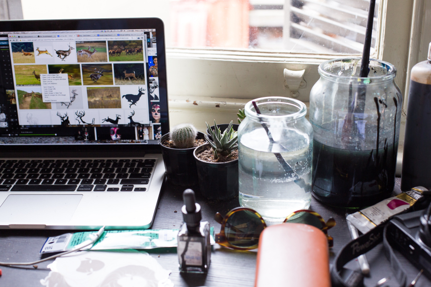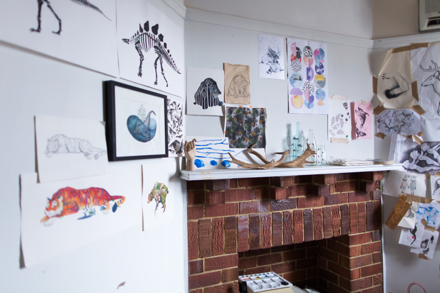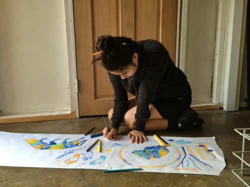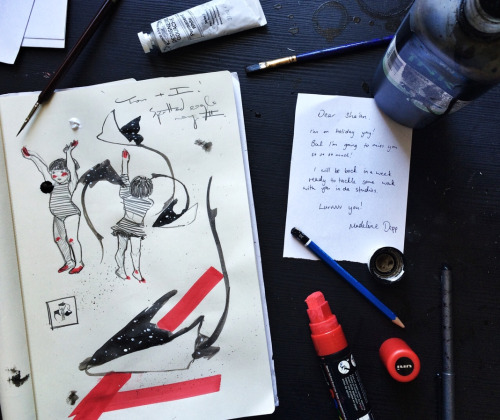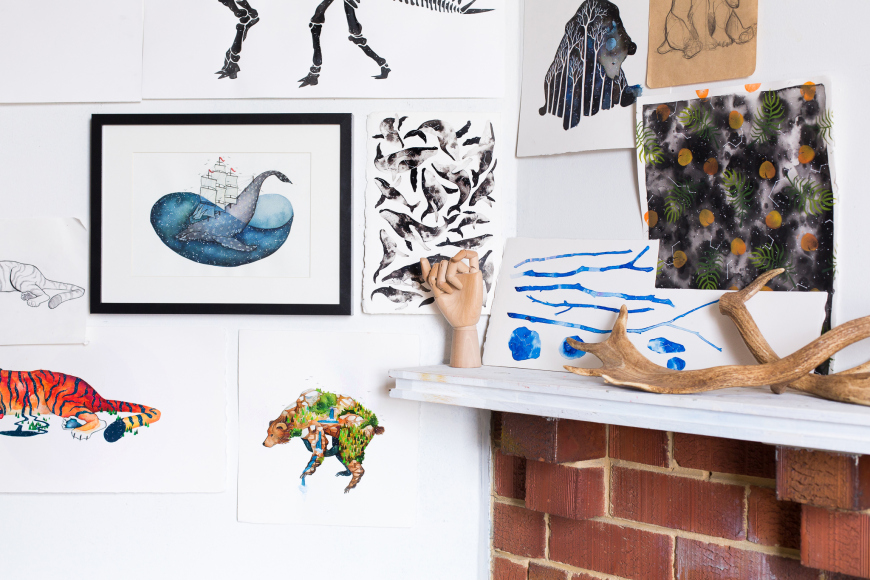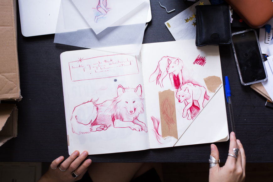 Quand Furry Little Peach crée, elle gribouille, entre en transe, mets de la musique et accroche tout aux murs de son studio. Une fois le sujet bien détaillé elle fait un croquis, le redessine au crayon graphite et commence les couches d’aquarelle – la magie opère alors…