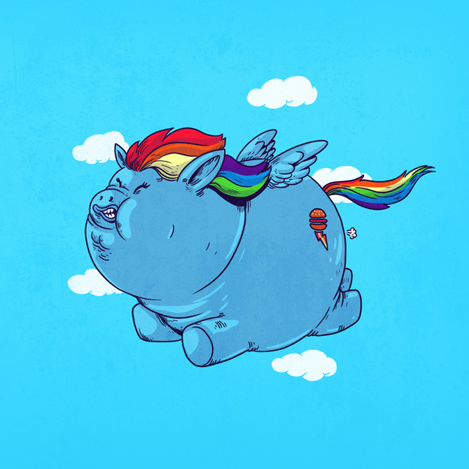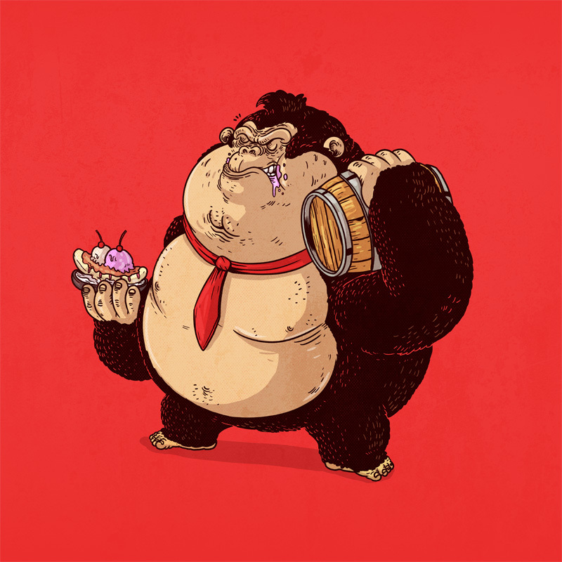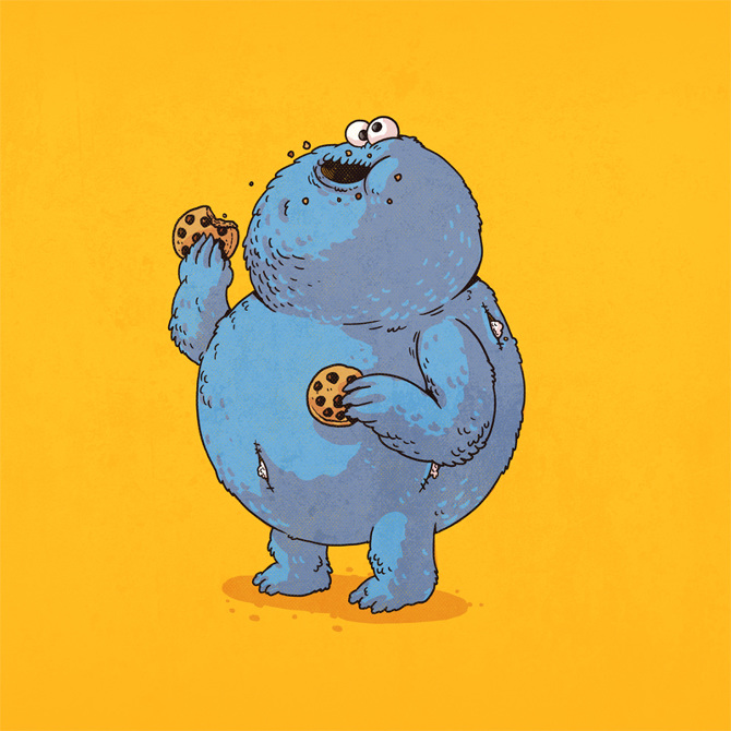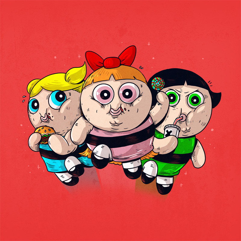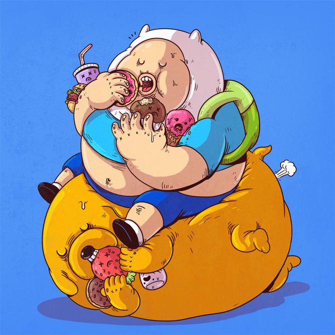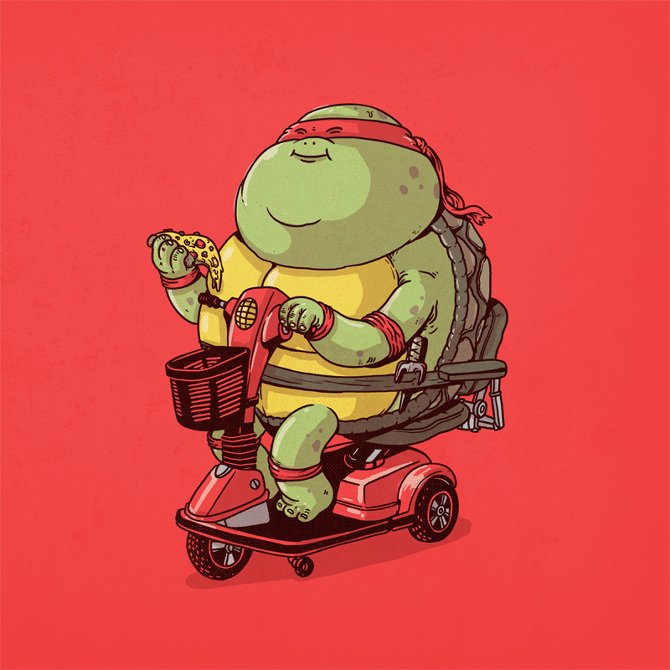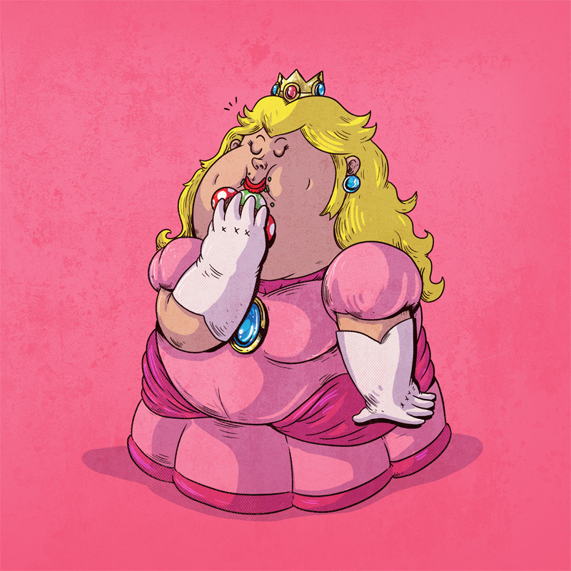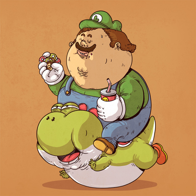 A travers cette série Alex Solis s’est rendu compte qu’il n’y avait pas que les Tortues Ninja qui aient un problème de boulimie : Sonic se gave de pièces, Mario dévore les champignons magiques, banche neige a englouti des tonnes de pommes. Il revisite chaque personnage en glouton, et ça doit bien faire rire sa fille et moi, par la même occasion.