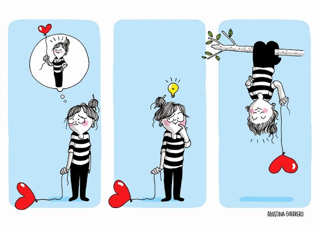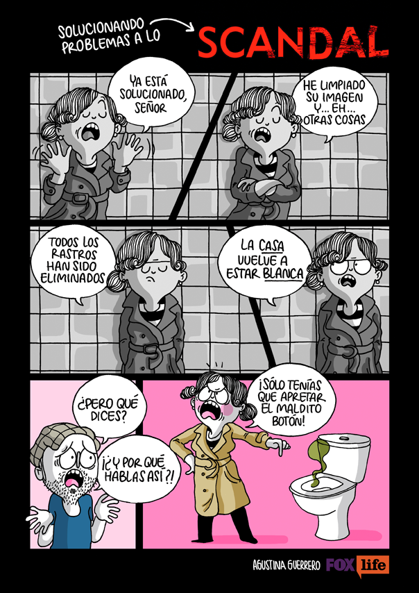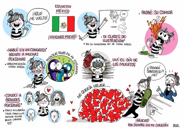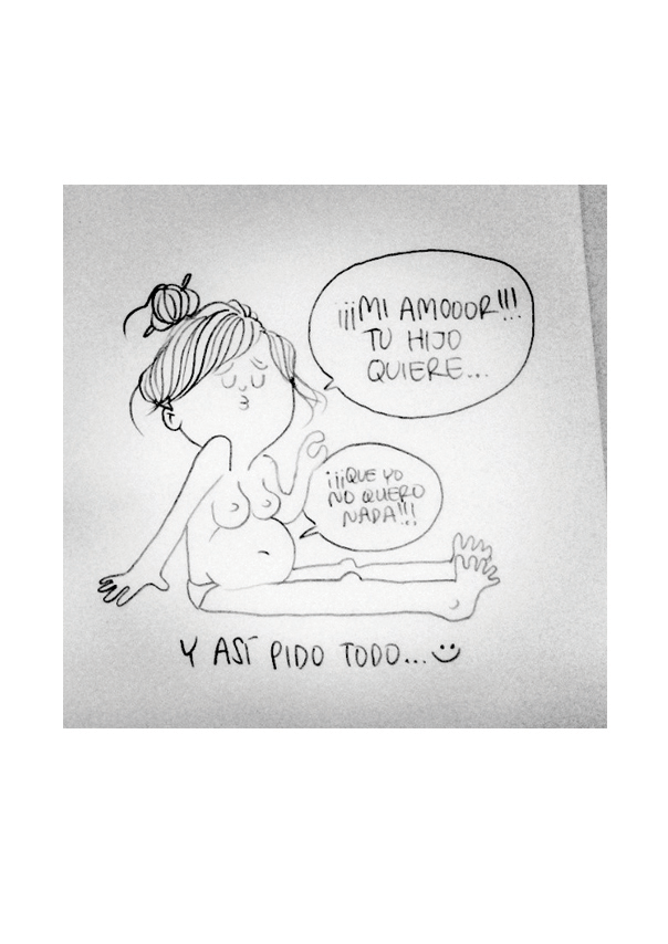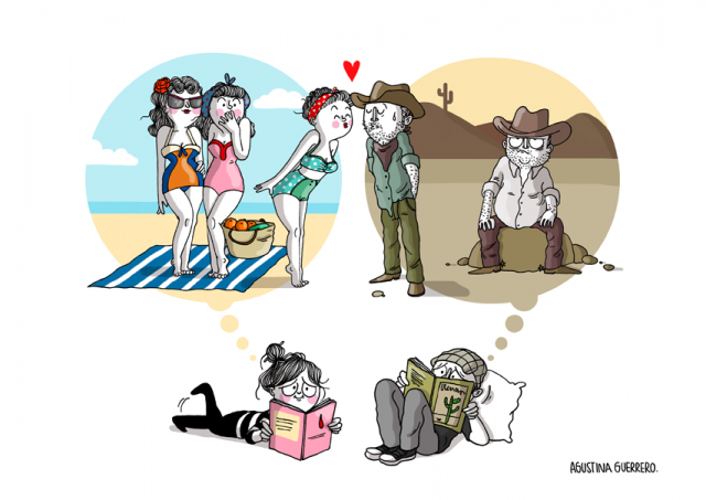 En général Agustina Guerrero puise ses idées de son propre vécu. Elle a l’esprit affûté et repère les bons dessins dans un bar, à la maison ou chez ses beaux-parents. Alors peu importe où elle se trouve, Agustina se met à dessiner immédiatement. Elle commence toujours par un croquis, puis elle structure l’idée. Plus tard elle redessinera au propre à l’aide d’un crayon à papier puis fera les lignes au feutre. Elle scannera, puis coloriera sur Photoshop.