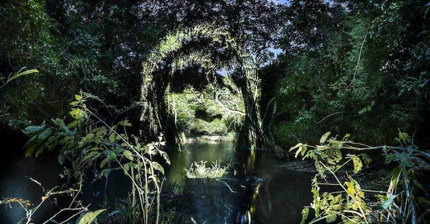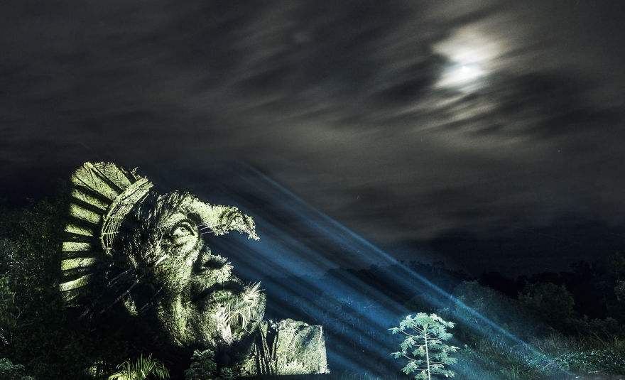 L’idée qu’il met en lumière depuis des années est de partir à la rencontre des personnes du cru et de les projeter dans leur environnement. Pour son projet Amazonia, il est parti à la rencontre des tous premiers artistes primitifs du “street-art” de la tribu Surui. Il s’est retrouvé alors au coeur de l’Amazonie et a illuminé les arbres de la forêts par des portraits de ce peuple. Découvrez à la suite, son travail et ses photos.