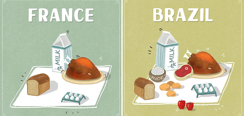 Avec 20 dollars en France, on ne fait pas la même chose qu’au Brésil, question de pouvoir d’achat. Un illustrateur s’est amusé à représenter ce que l’on peut manger pour 20 dollars dans différents pays.