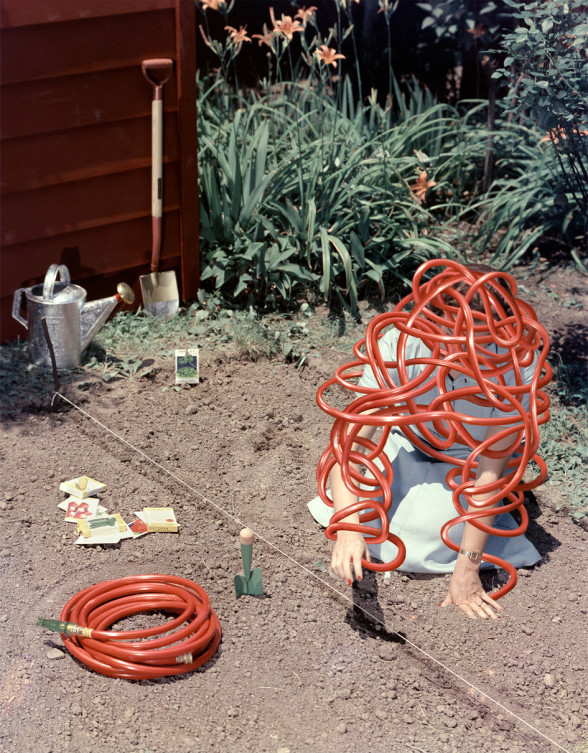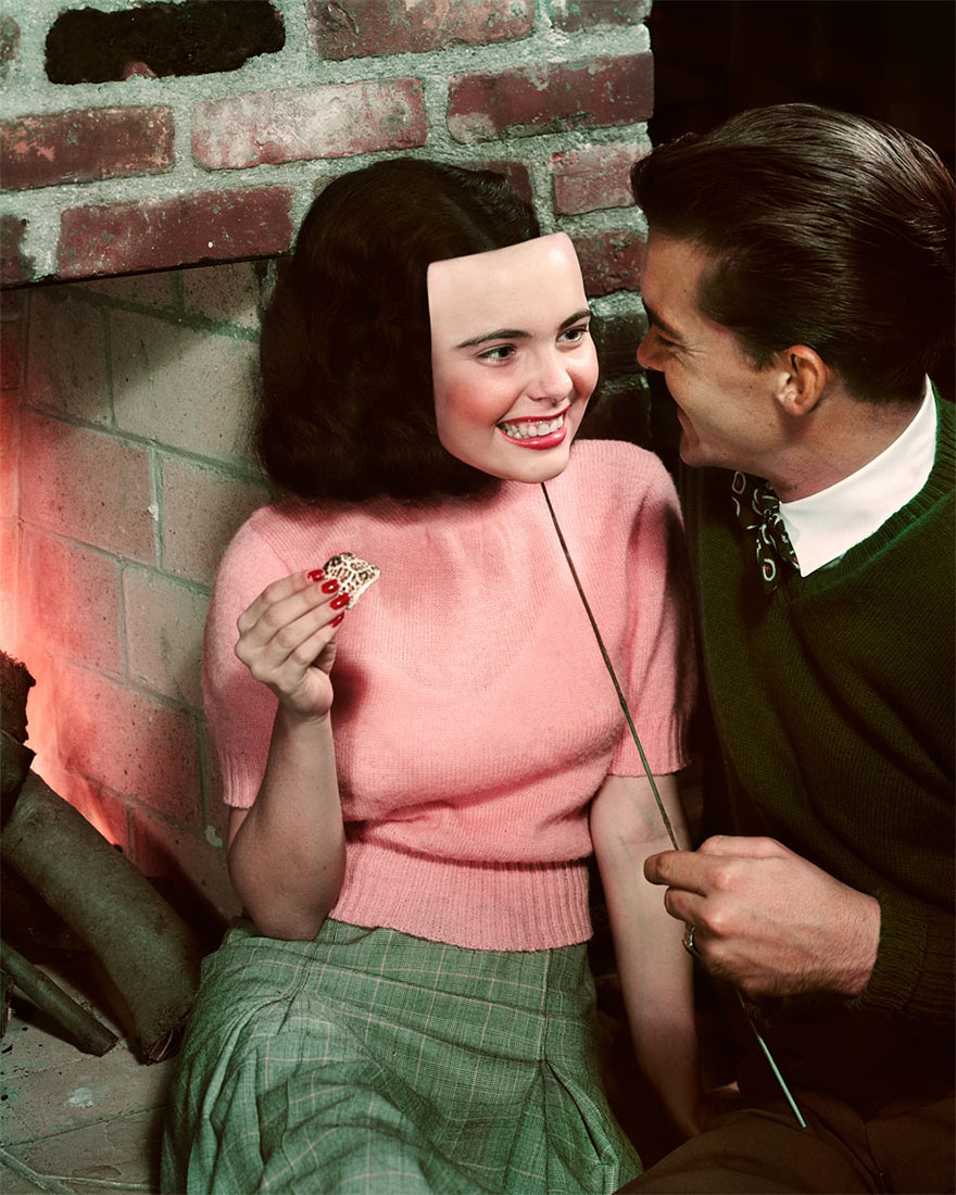 Wéronika Gęsicka s’amuse donc avec notre mémoire collective. Elle composent ses propres images en manipulant et décomposant de vieilles publicités des années 50’s et 60’s. Modifiant légèrement l’image d’époque avec quelques détails mineurs qui transforment la photographie occasionnelle en une réalité déformée surréaliste. Des images aux détails surréalistes, manipulations étranges qui vient perturber nos souvenirs. Son travail soulève la question de l’importance des photographies pour la préservation de la mémoire. À une époque où presque tout est travaillé et retravaillé avec le numérique, les images de Wéronika Gęsicka font écho avec une certaine peur insatiable de l’oubli.