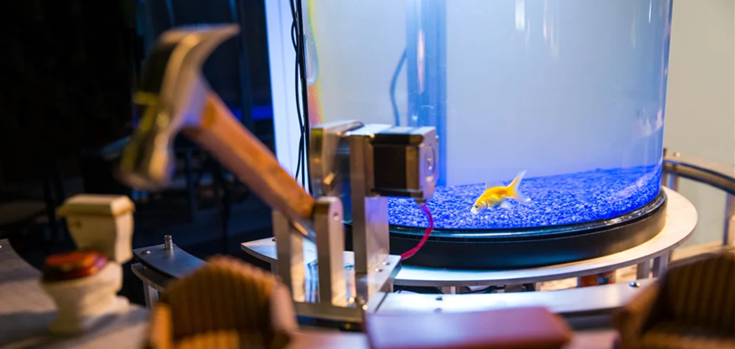 L’artiste Neil Mendoza a eu une idée de génie en connectant un marteau aux déplacements de son poisson rouge pour qu’il détruise des petits meubles placés autour. On vous prévient, on a eu un coup de coeur créatif pour cette idée de l’artiste américain Neil Mendoza.