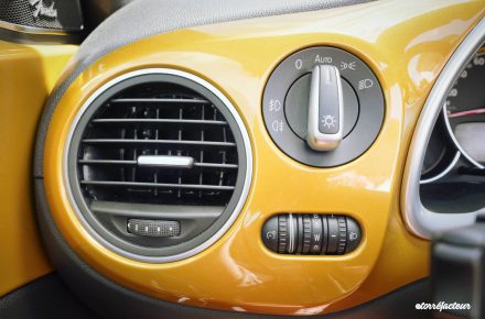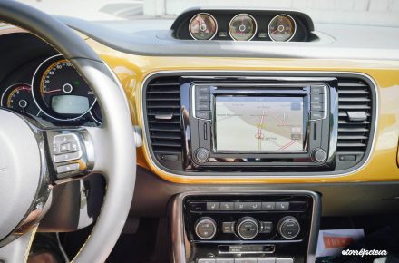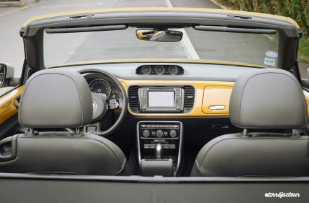 La Coccinelle Dune n’est pas qu’une voiture lookée. Cette version Dune reçoit aussi un équipement complet, avec notamment un système d’info-divertissement moderne et pratique avec Android Auto et Apple CarPlay, les aides au stationnement avant et arrière et une climatisation bi-zone, un écran tactile de 6,5” et un volant en cuir multifonction spécifiques ‘Dune’ (avec palettes au volant sur DSG ; difficile à atteindre cependant). De quoi offrir un bon compromis avec l’ambiance rétro très particulière que Volkswagen a su créer à bord de sa Coccinelle, avec son pare-brise très vertical et une boîte à gants rappelant le modèle d’origine. Le tout en bénéficiant de l’ergonomie impeccable des modèles du reste de la gamme.