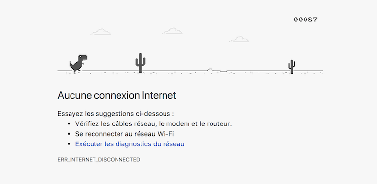 Comment ça, vous ne connaissez pas le petit jeu caché Dino Jumper sur Chrome ?… J’espère que non… Je vous explique. Lorsque vous êtes déconnecté d’Internet et naviguez sur Chrome, Google vous propose de prendre les manettes d’un T-Rex et de sauter le plus possible de cactus en patientant que la connexion réseau revienne. Pour lancer le jeu, c’est très simple. Déconnectez-vous d’Internet, lancez une page sur Chrome et appuyez sur une touche de votre clavier ; barre d’espace ou touches directionnelles. Il ne vous restera plus qu’à faire preuve de dextérité. Et d’un coup, vous oublierez totalement ce besoin primordial de voir Facebook.