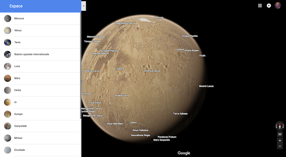 Il est désormais possible de partir à la conquête de l’espace rien qu’avec Google Maps. Le service de cartographie de Google vous propose ainsi d’explorer le système solaire ; pour cela il suffit de dézoomer en vue satellite, jusqu’à quitter la Terre 🌎