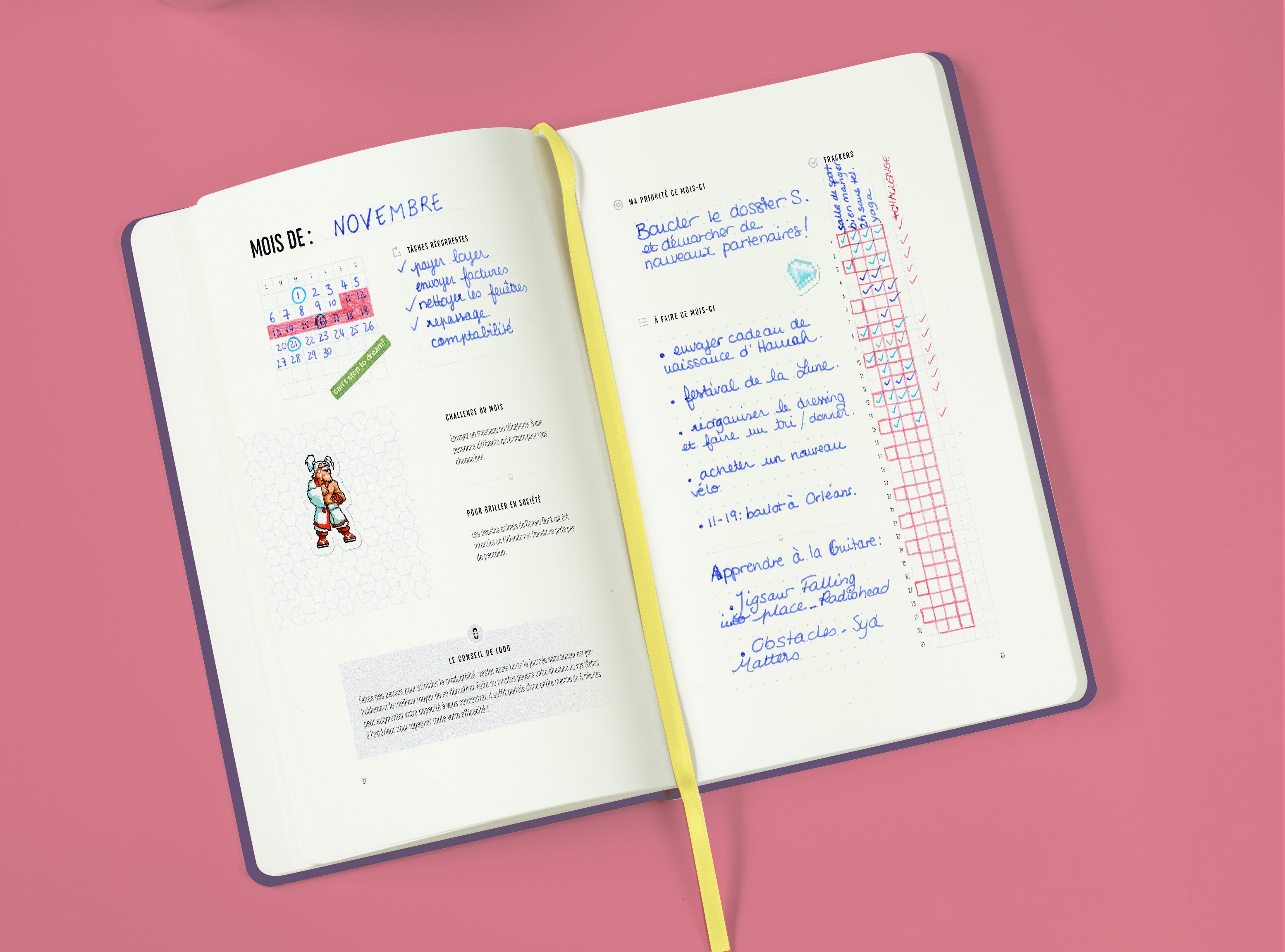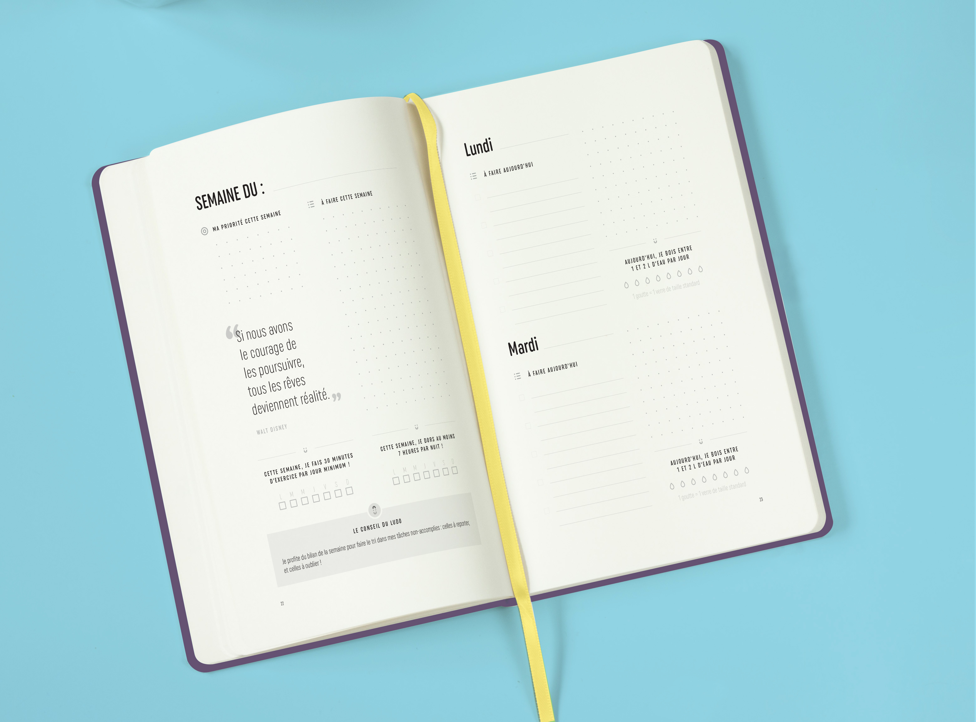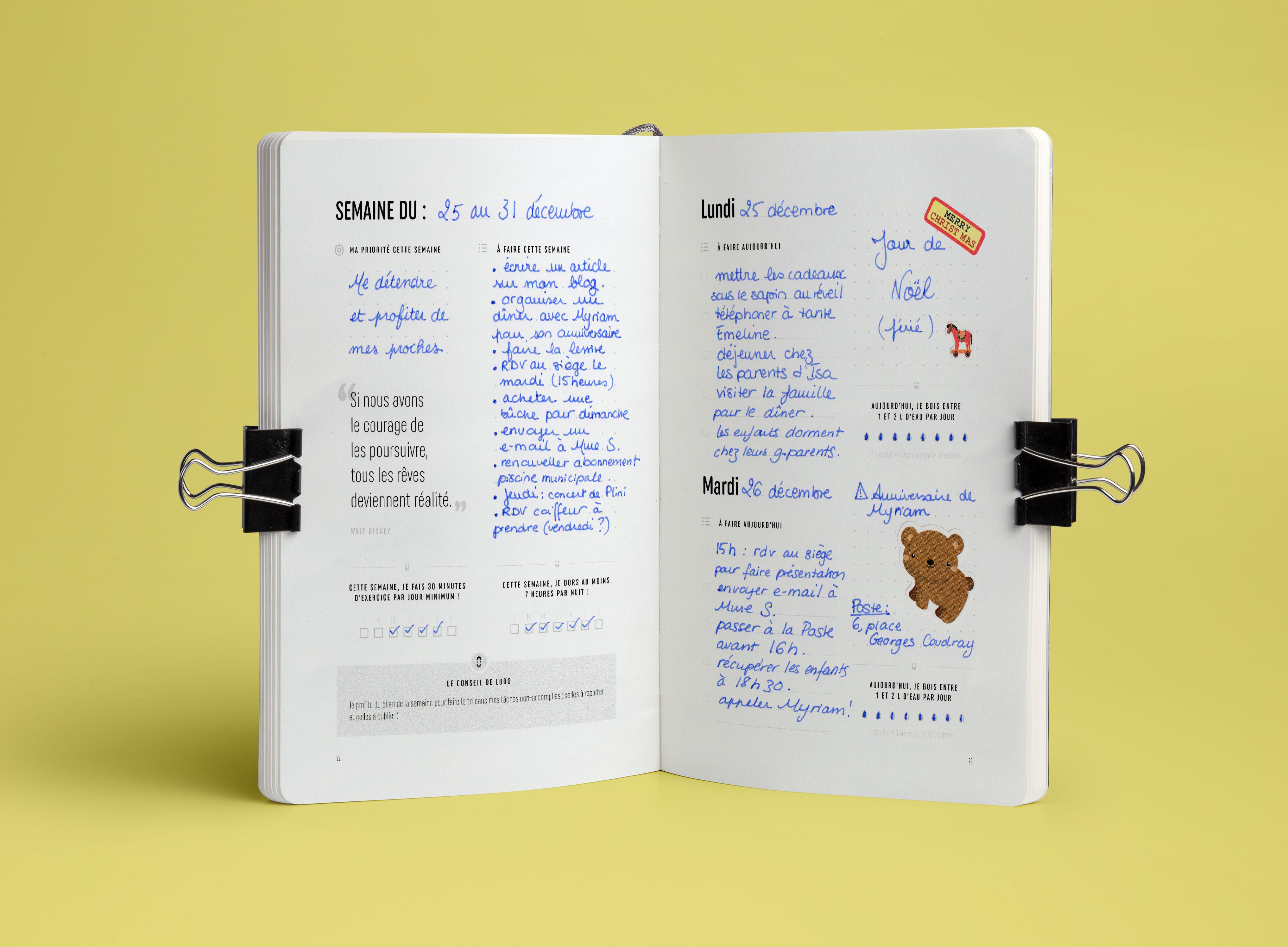 LuDo c’est 320 pages non-datées, afin qu’il puisse couvrir 53 semaines (soit un peu plus d’un an), quelle que soit la date à laquelle vous décidez de commencer à l’utiliser. Vendu au prix de 25 euros. Les frais de port de 5 € sont offerts sur Ulule.