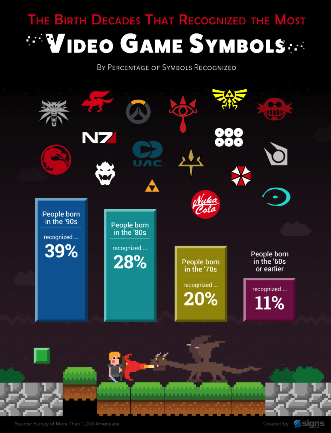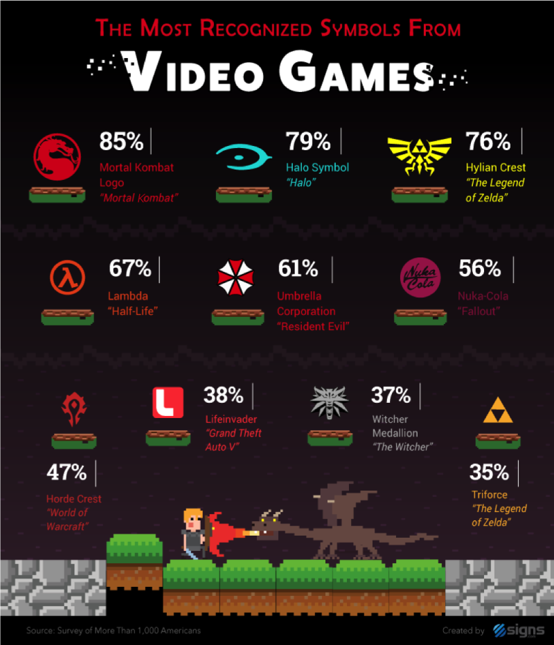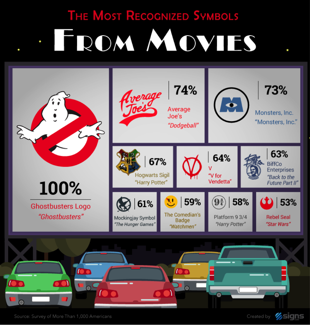 Cependant, la mémoire est une chose délicate. Quand il s’agit de la conscience collective, les phénomènes de l’effet Mandela peuvent entrer en jeu ; quand notre mémoire construit des réalités parallèles. Les gens se souviennent souvent des faits et des images, mais parfois les détails sont rappelés d’une manière différente de la façon dont ils se sont réellement produits ou ont existé. Dans cette étude sur les symboles de la culture pop, signs.com a demandé à plus de 1 000 participants d’identifier 181 symboles et logos fictifs que nous avons vu dans des films, à la télévision ou dans les jeux vidéo. La plupart des personnes interrogées les ont facilement reconnues en raison de leur exposition fréquente à la culture pop américaine, alors que d’autres images pourtant populaires sont presque restées oubliées. Pour info, le sondage a été réalisé aux États-Unis, ce qui joue forcément de notre propre perception européenne de cette culture populaire.