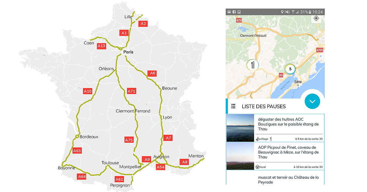 Des idées de pauses sont également annoncées quelques kilomètres avant la sortie, en précisant la distance par rapport à la sortie, pour permettre au voyageur de prendre une décision. Ces pauses qualitatives, sélectionnées selon trois critères précis – facilité d’accès, beauté du site et qualité de l’offre – sont de type culture, nature ou terroir. Elles sont par ailleurs présentées sur une carte qui peut être consultée avant le départ ou pendant le trajet.
