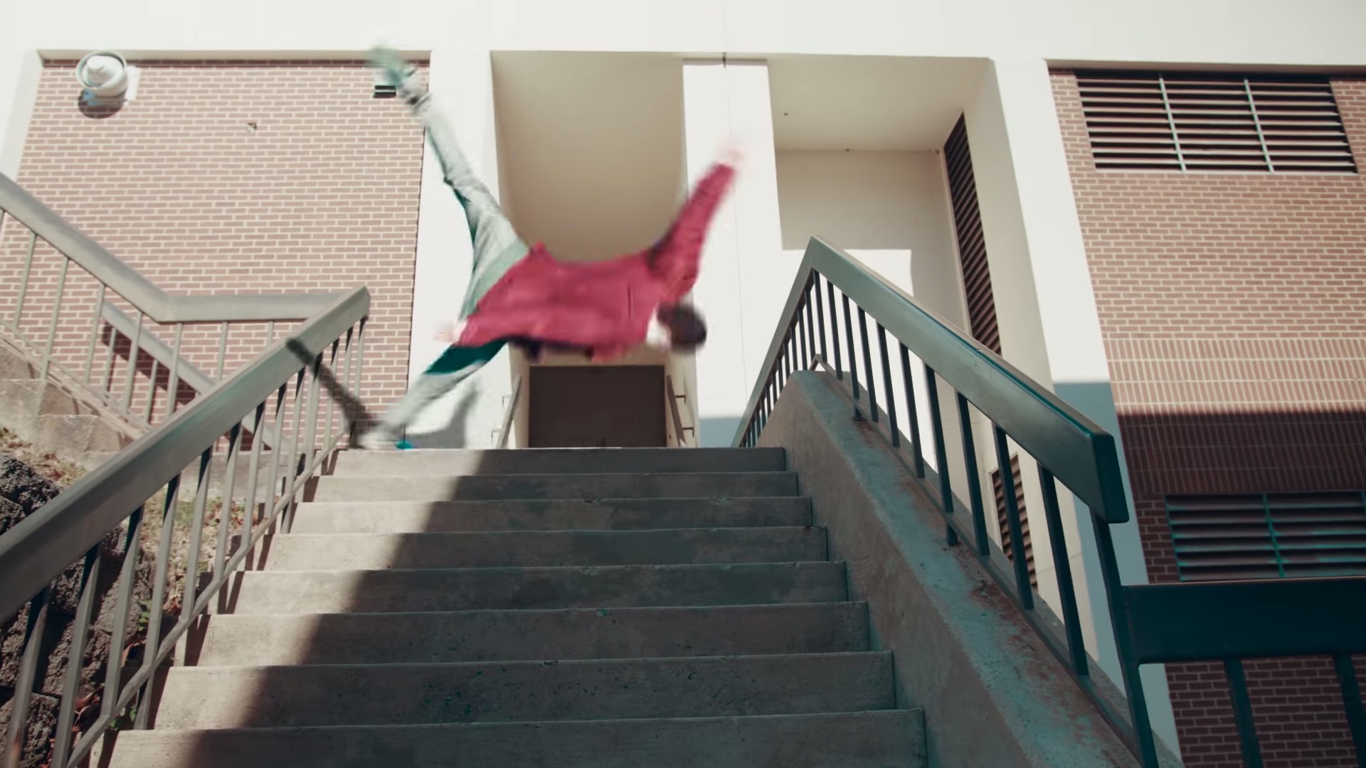 C’est l’histoire d’un jeune homme qui tombe dans les escaliers et provoque un chaos à travers toute la ville.