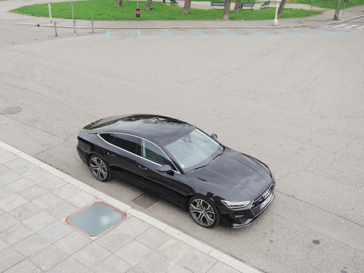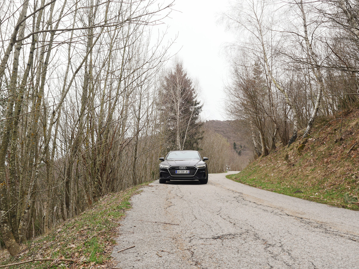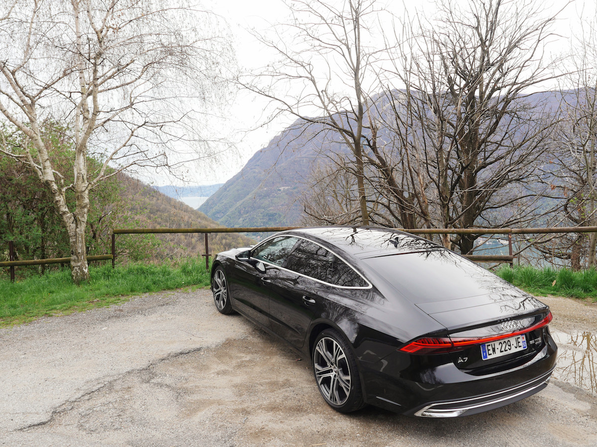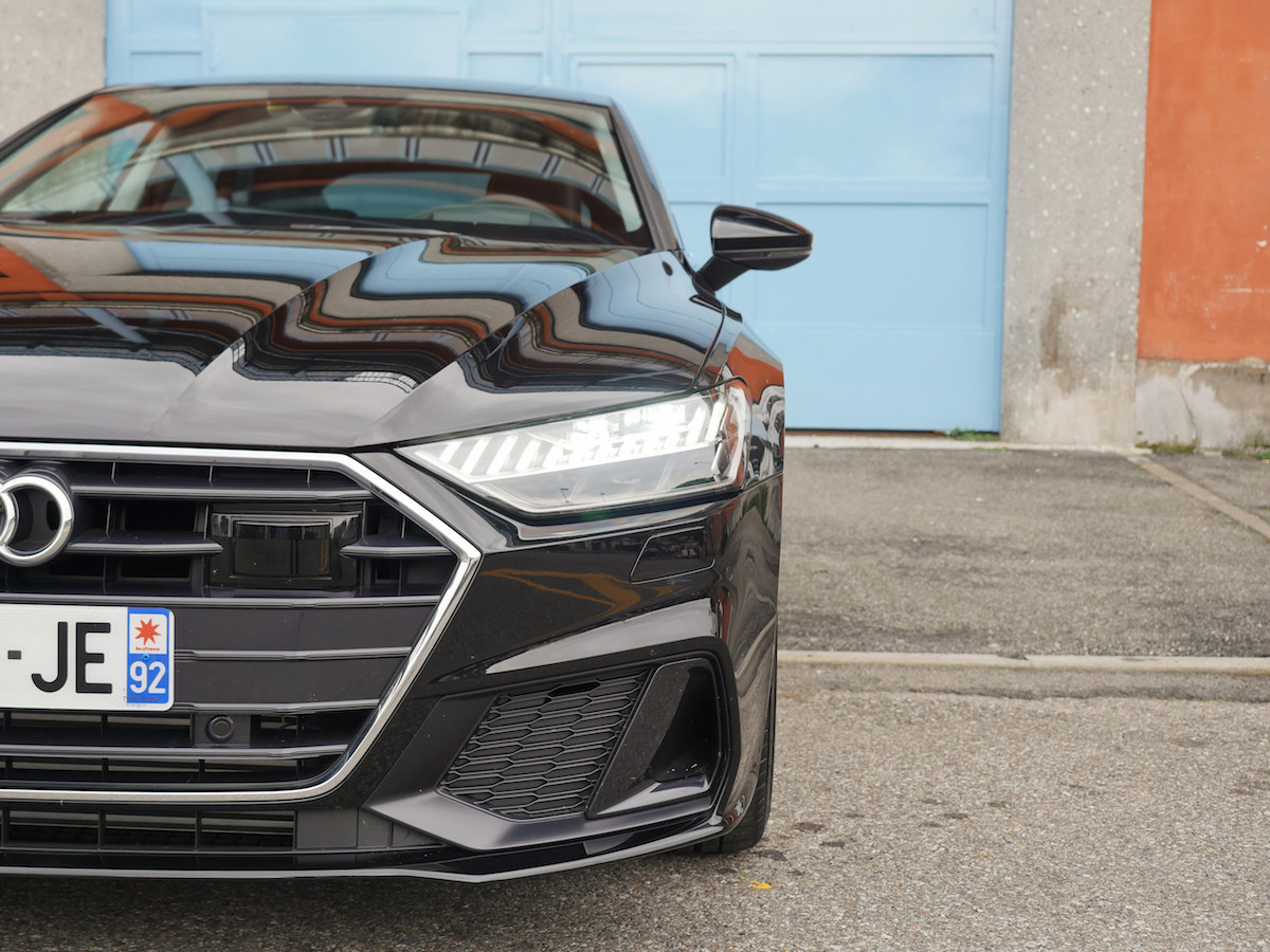 Derrière le volant, le fameux Virtual Cockpit, un écran de 12,3 pouces (non tactile forcément) accessible depuis les commandes au volant, avec la possibilité de mettre en avant les compteurs de vitesse et de régime moteur encadrant la navigation, ou vice versa. On peut également afficher le titre du morceau joué à la radio ou carte SD ou smartphone ou encore afficher l’arrivée d’un SMS. Bien entendu, tout ce qui concerne la bonne marche du véhicule (consommation et vitesse moyenne, carburant restant, température d’huile…) y est visible dans le Virtual Cockpit. Rien de nouveaux sous le soleil italien. Par contre au centre du tableau de bord, vous retrouvez dorénavant deux écrans Oled, tournés vers le conducteur. Le premier au dessus, le principal de 10,1 pouces, est destiné à tout l’infodivertissement et aux différents réglages spécifiques au véhicule, que vous pouvez mettre en favori plus facilement, comme sur votre smartphone. Le deuxième écran du dessous, plus petit, permet de régler l’aération de l’habitacle. Pour les allergiques au tout-tactile ou ceux ne souhaitent pas quitter la route des yeux, l’Audi A7 Sportback est également équipée de la dernière version de la reconnaissance vocale. À l’image de la grande sœur A8, l’A7 abandonne les phrases et les mots-clés pré-enregistrés. Ici, c’est le langage naturel qui est de mise : “J’ai faim” et le GPS vous indique quelques restaurants sur votre route ou “J’ai froid” et le chauffage se lance. Côté lumière, les projecteurs Audi Matrix LED HD procurent à la nouvelle Audi A7 Sportback une signature lumineuse unique. Composés de 12 segments lumineux alignés les phares produisent un faisceau lumineux avant-gardiste reprenant le principe du langage binaire (0101) de la digitalisation. Leitmotiv forcément. Sans oublier que cette nouvelle A7 reprend le châssis de la A8, donc notamment les quatre roues directrices, qui deviennent rapidement indispensable sur les petites routes et courbes italiennes. L’A7 Sportback mesure quand même 4,97 mètres et pèse presque 2 tonnes.