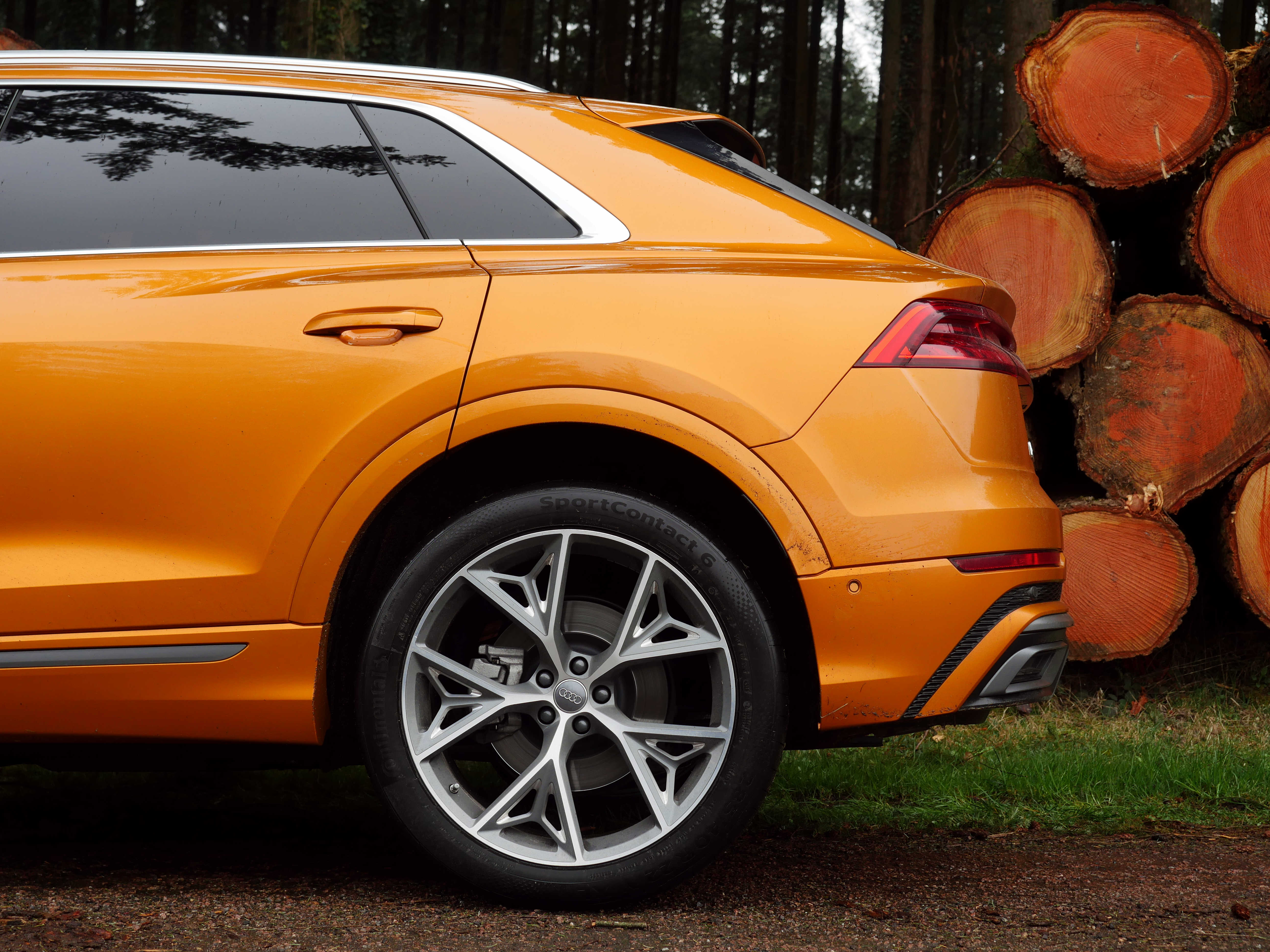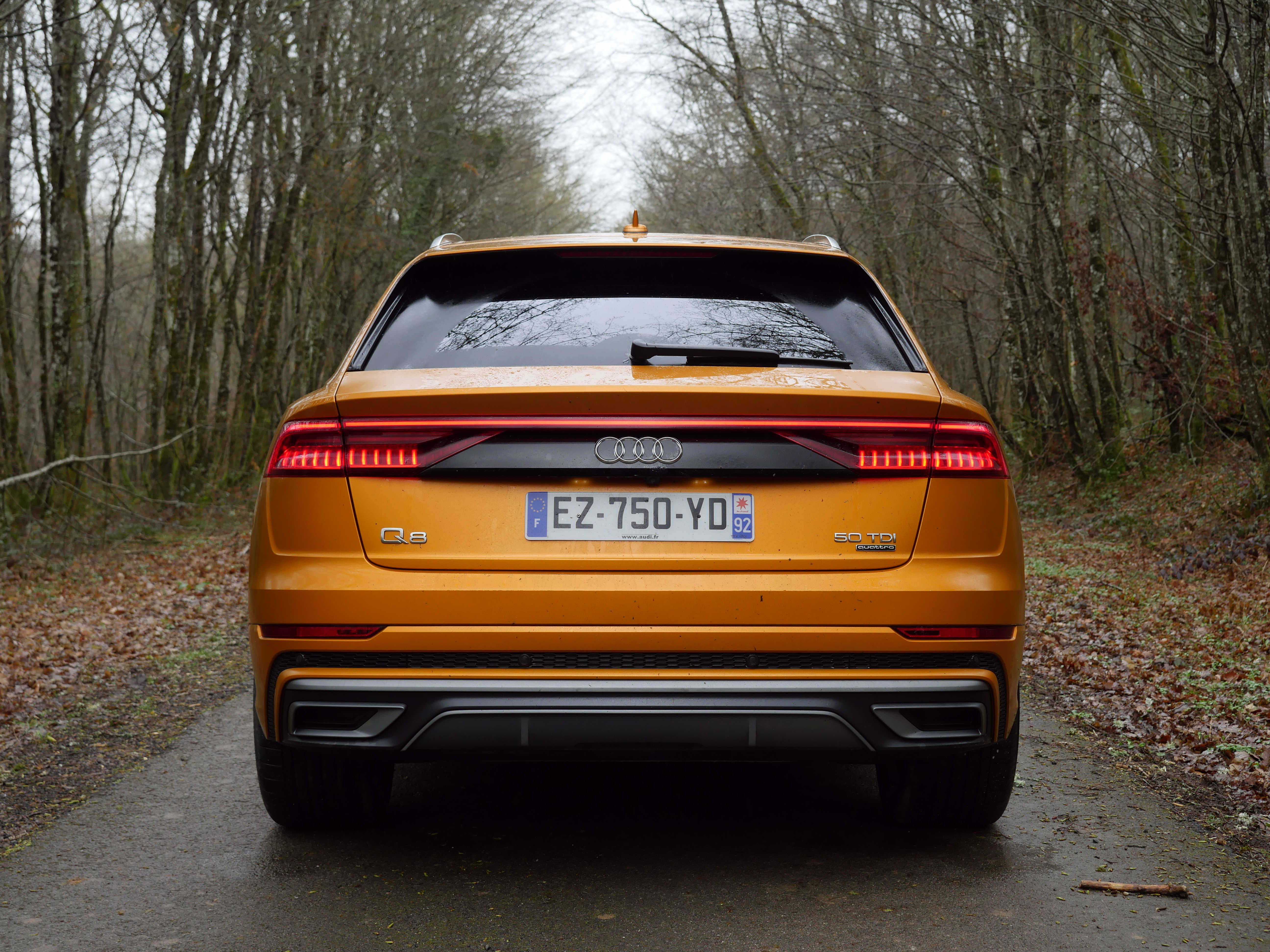Outre son design sexy, l’Audi Q8 incarne à la perfection la sportivité selon Audi : efficiente, agile et dynamique. Son différentiel central 100% mécanique offre par défaut une répartition du couple à 40:60, privilégiant ainsi l’essieu arrière pour une conduite typée propulsion. Si besoin, la majorité du couple peut être transférée sur l’essieu bénéficiant de la meilleure motricité. En plus de la direction progressive de série qui réduit l’effort de braquage au volant, l’Audi Q8 peut être équipée en option de roues directrices. Dans ce cas les deux roues arrière s’orientent jusqu’à 5 degrés, dans le sens inverse des roues avant pour amplifier le braquage à basse vitesse et dans le même sens pour augmenter l’agilité et la stabilité à haute vitesse. Le Q8 malgré son gabarit se manie avec une géniale maniabilité.