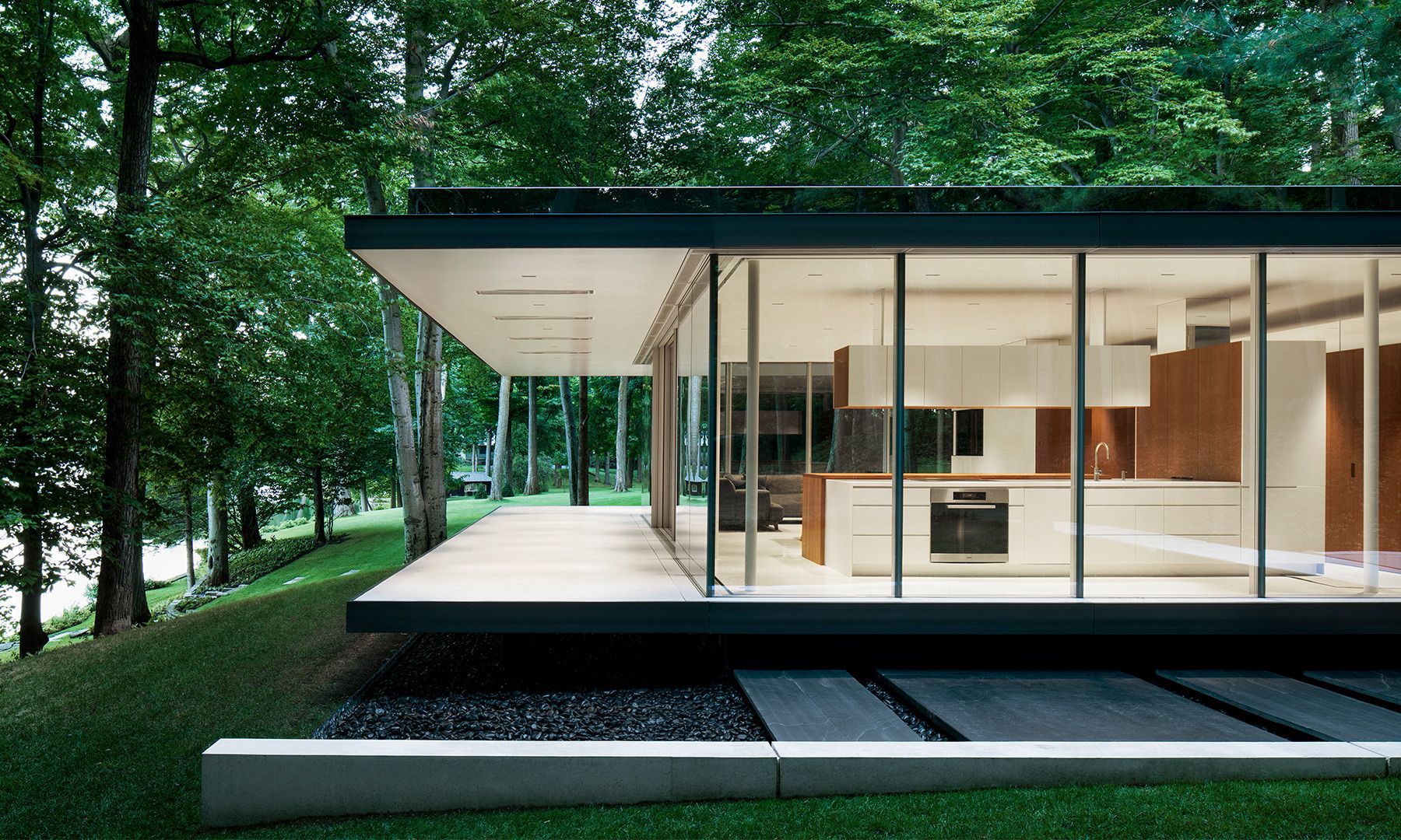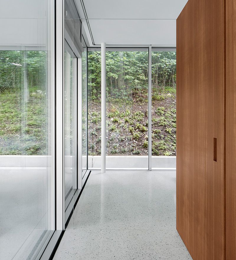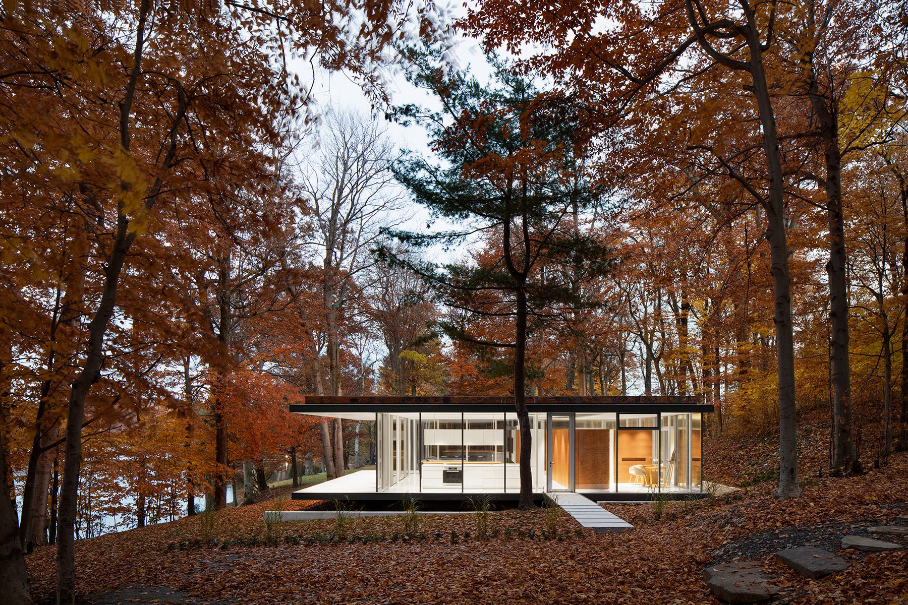 La maison d’hôtes est située sur une pente douce et s’étend légèrement sur le terrain avec une fondation surélevée qui semble flotter au-dessus du sol. Son extérieur est entièrement composé, des quatre côtés, de fenêtres allant du sol au plafond. Le triple vitrage a été utilisé pour réduire la consommation d’énergie. Les caractéristiques naturelles du paysage ont été laissées intactes et des mesures particulières ont été prises pour minimiser l’impact potentiel, en concevant le toit plat comme un lit de plantes pour immerger davantage l’architecture dans le paysage. Pendant la journée, le Pavillon du Lac tout de verre vêtu reflète alors le paysage mais devient complètement transparente après le coucher du soleil. Brouillant alors les frontières entre naturel et artificiel.