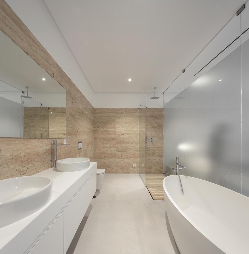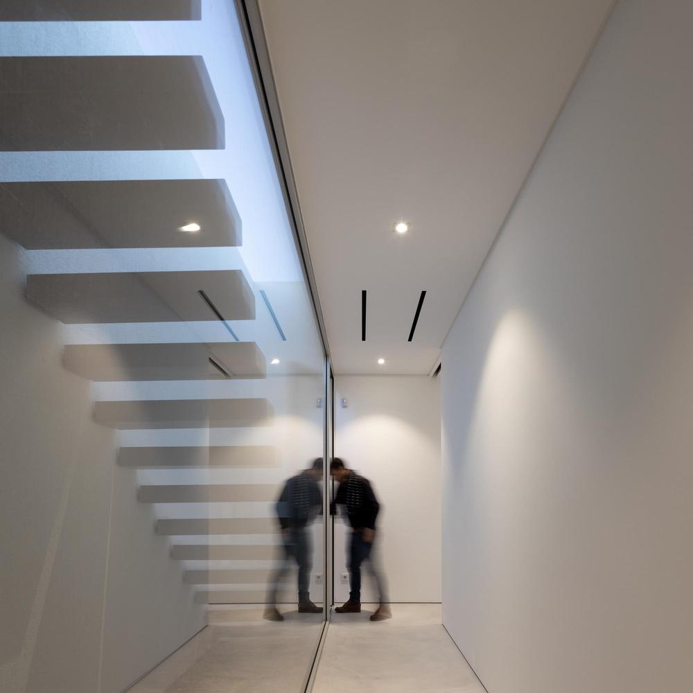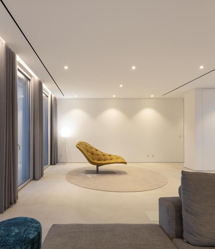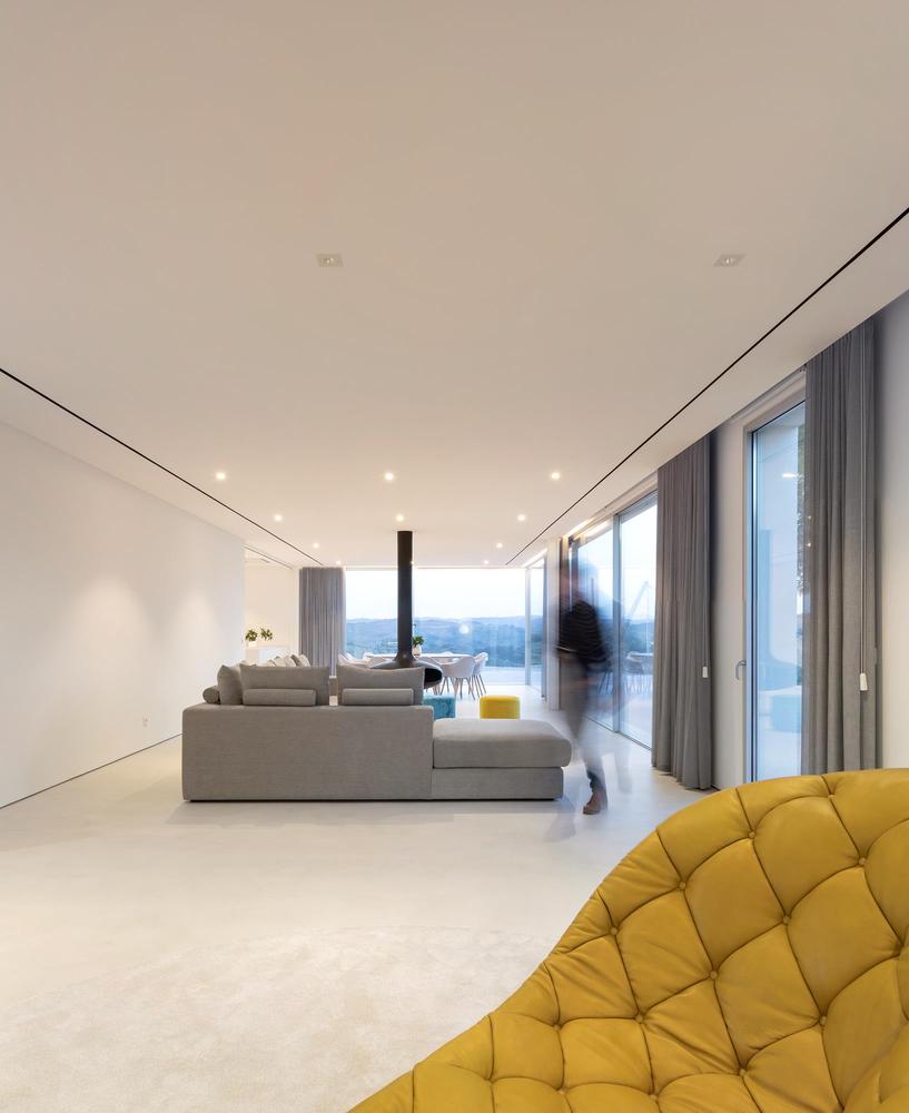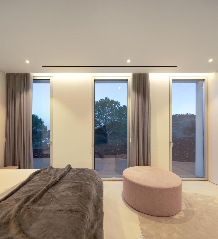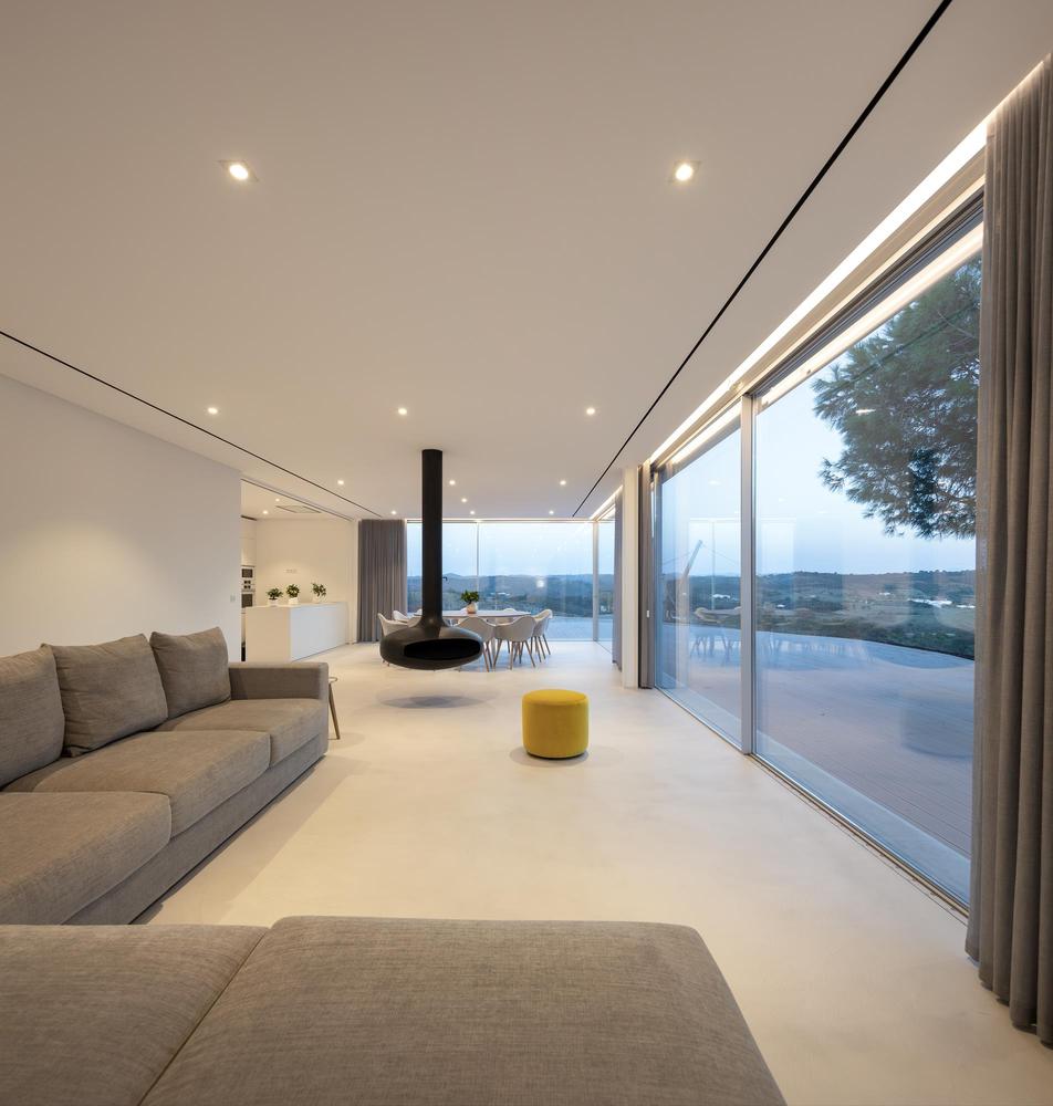 À l’intérieur, l’esthétique minimaliste et la palette monochromatique persistent. Très simplement, une série de fenêtres orientées à l’est tirent parti de la lumière entrante, tandis que le vitrage du sol au plafond dans le salon principal met en valeur les points de vue.