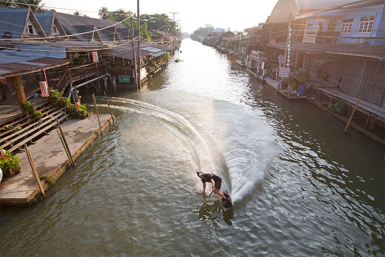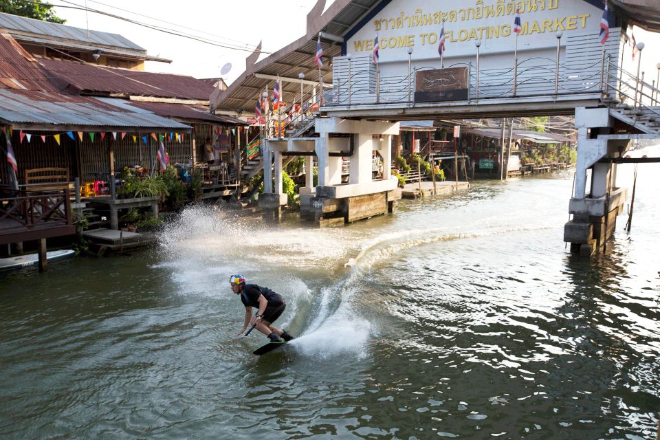 Vous voulez un peu de fraîcheur ? Regardez Dominik Gührs en wakeboard à travers les voies navigables de Bangkok et ses marchés flottants. Tout simplement.
