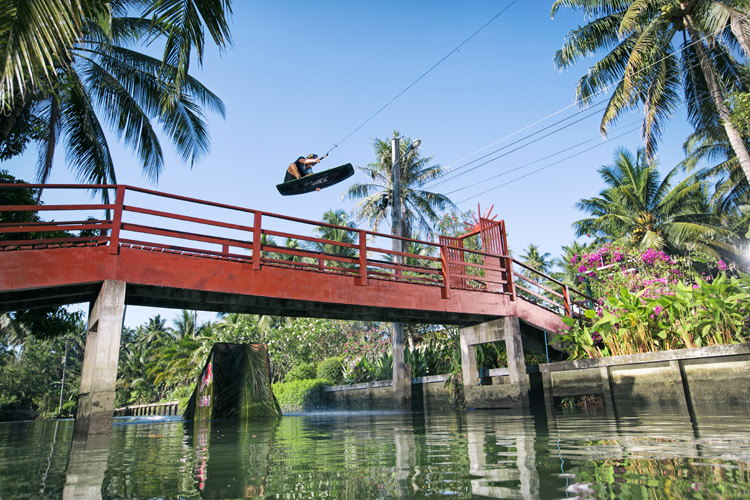Qui ne connaît pas ce problème : il faut rapidement se rendre du point A au point B, mais les routes sont encombrées par la circulation. Surtout à Bangkok. Une ville à 8,3 millions d’habitants et une densité de population d’environ 14 000 habitants par kilomètre carré. Cela peut poser un problème pour circuler dans rues encombrées, à moins que vous ne connaissiez un raccourci. Heureusement, Dominik Gührs connaît parfaitement la ville de Bangkok, raison pour laquelle il peut facilement ignorer le trafic, abandonner le tuk tuk, sauter sur son wakeboard et utiliser les voies navigables et les marchés flottants. Tranquille.
