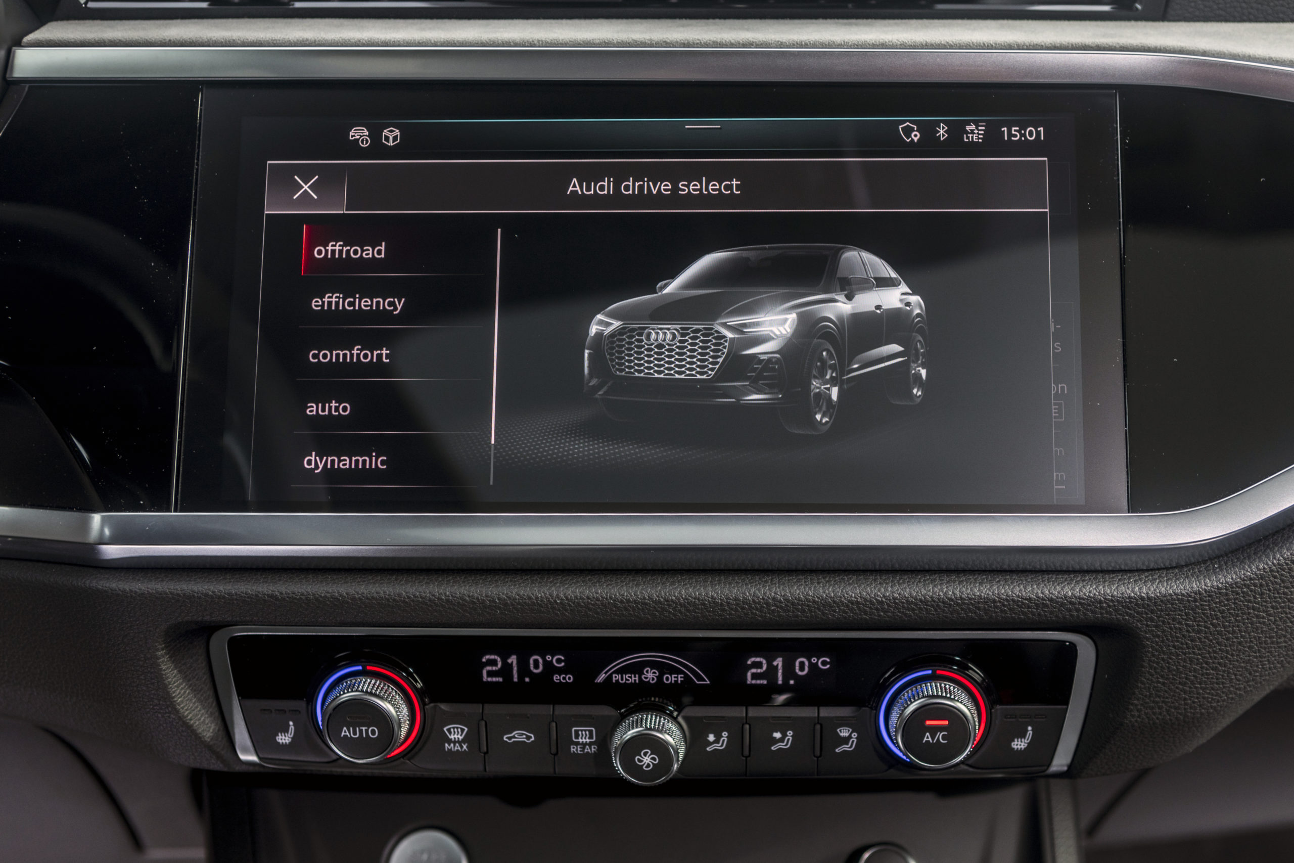 L’Audi Q3 Sportback est très agréable à conduire, cela sur tous les différents terrains : en ville, sur les longues distances ou en tout-terrain. De série, elle comprend une direction assistée progressive sportive, qui offre les avantages d’un rapport dépendant de l’angle de braquage. Alors que l’angle de braquage augmente, le rapport devient plus direct, ce qui facilite le braquage dans la circulation urbaine et pour les manœuvres. Dans les virages serrés, l’Audi Q3 Sportback est particulièrement dynamique, elle fait preuve d’une agilité spontanée et d’un haut niveau de confort, en particulier avec la suspension sport, que je vous recommande de sélectionner comme alternative à la suspension standard (sans supplément). Bien évidemment, pour adapter les caractéristiques du SUV en fonction des besoins, il y a l’Audi drive select. Celui-ci comprend toujours les six modes de conduite : auto, comfort, dynamic, offroad, efficiency et individual. Une fois sélectionné, chaque mode va impacter la réponse de l’accélérateur, la direction, le passage des rapports de vitesse de la boîte S tronic ainsi que l’amortissement piloté. L’amortissement sur chaque roue est adapté aux conditions de la route et à la situation de conduite en quelques millisecondes. Ainsi, la tenue de route oscille entre souple et ferme. Et c’est certainement là que le confort est le plus impressionnant.