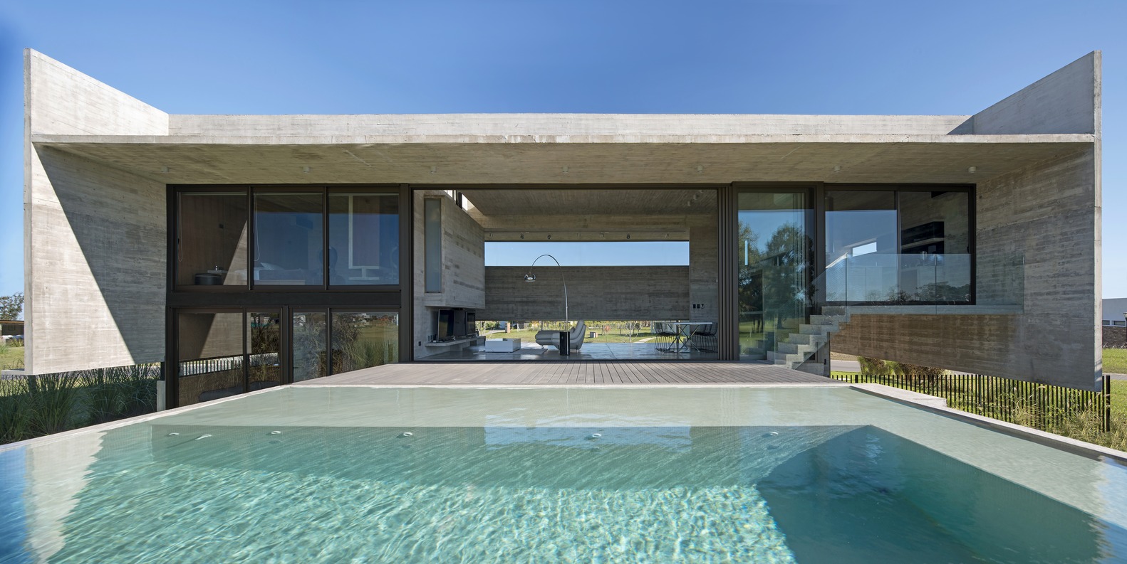Le logement, conçu par Luciano Kruk, est situé sur un terrain de golf entouré de vastes plaines plates. Conçu comme l’espace le plus important de la maison, les lieux de vie du rez-de-chaussée profitent un dégagement supérieur à celui des autres pièces, s’élevant au-dessus du niveau du terrain naturel afin d’obtenir un panorama bien plus grand sur l’environnement extérieur et profiter du paysage verdoyant aux alentours. Ce qui en fait un certain charme unique. Le dessin d’ensemble est ingénieux en tout cas.