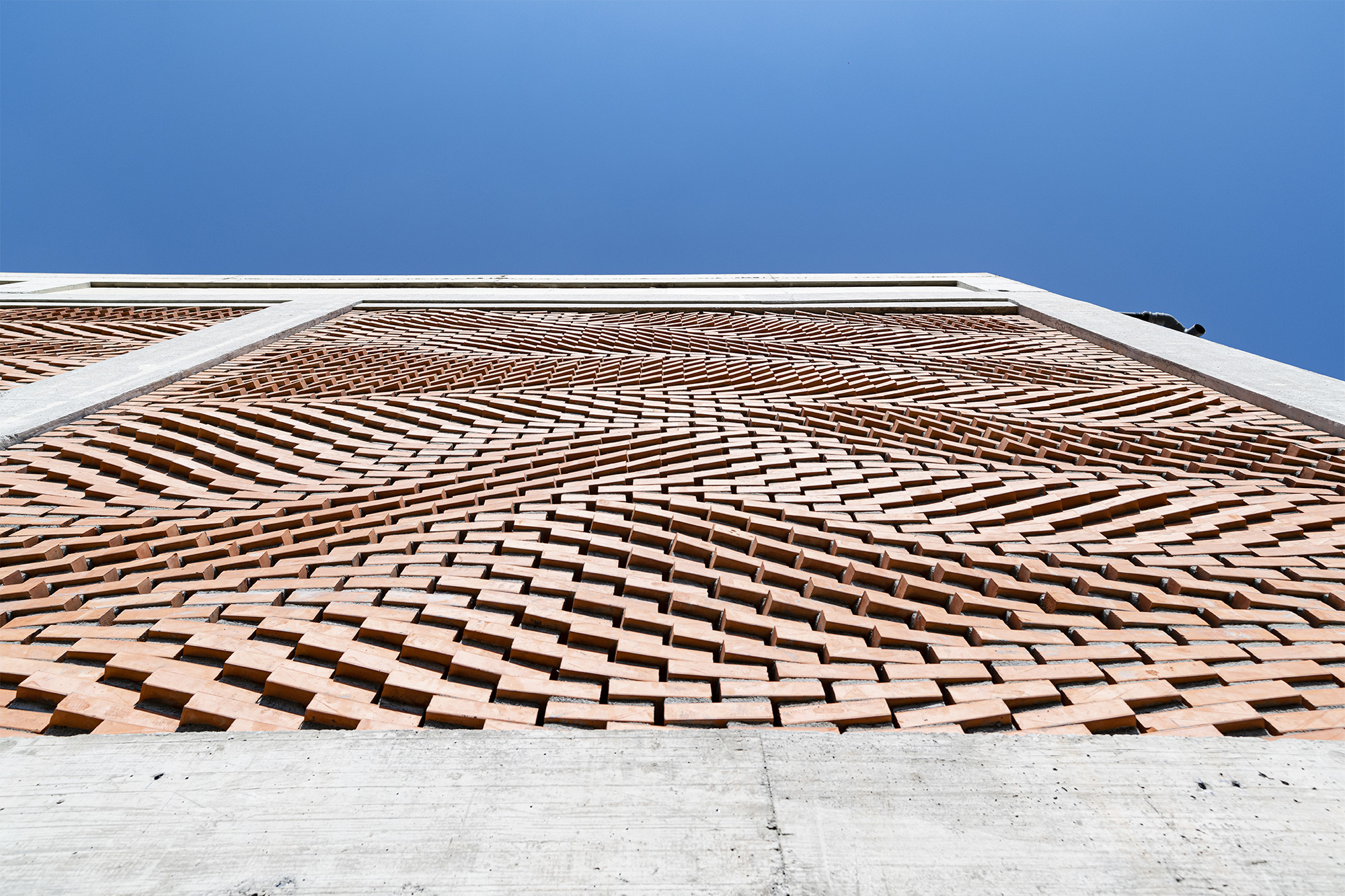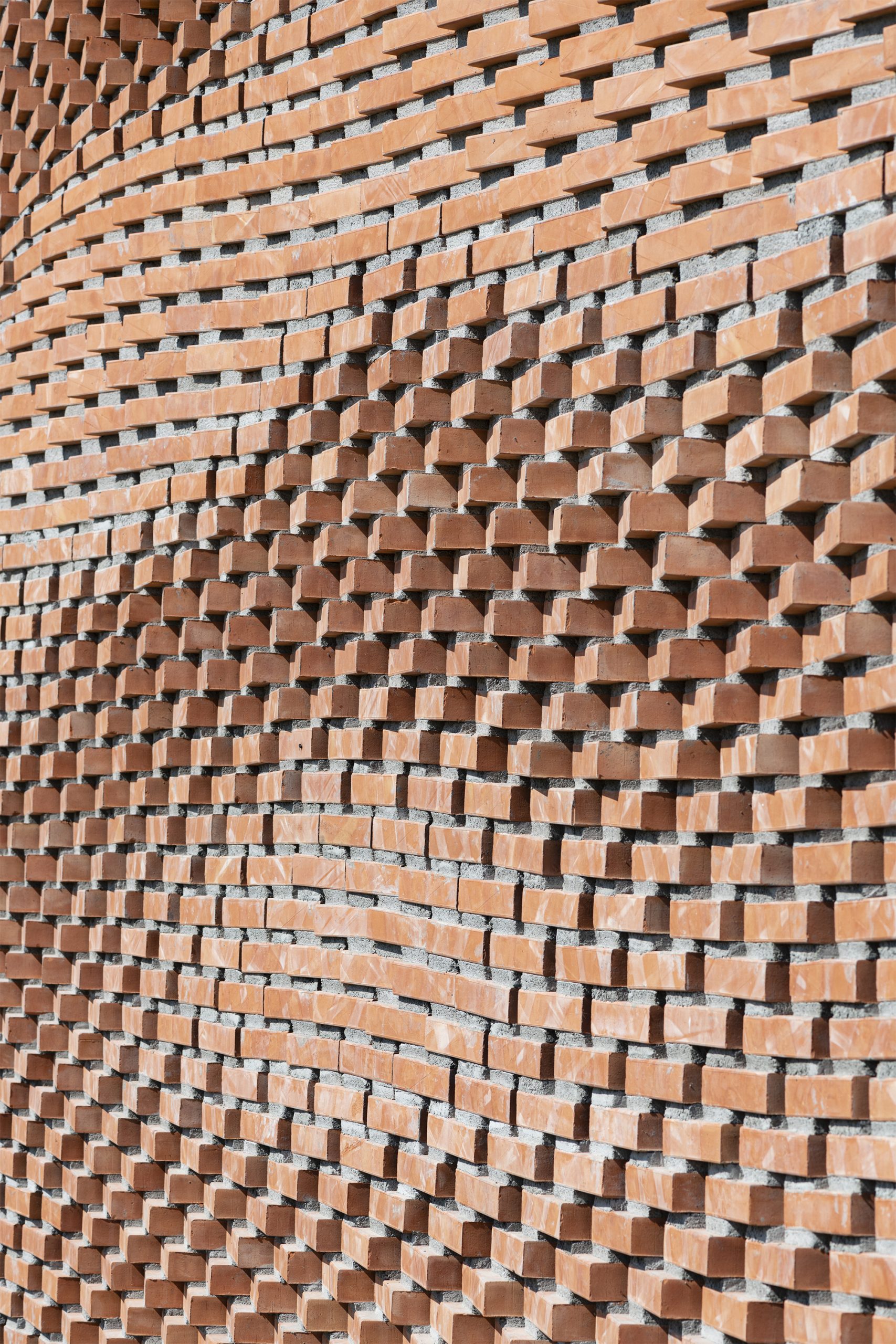 Pour créer la structure de 225 mètres carrés que vous voyez en images, les maçons ont assemblé pas moins de 13 596 briques dans différentes rangées. Les hauteurs de mortier différenciées varient de 5 à 30 millimètres et aident alors à déterminer la rotation de chaque brique qui varie de -20° à + 20°. “De cette façon, le mortier, généralement traité comme matériau secondaire dans la conception des murs en brique à face claire, est devenu un élément déterminant de l’apparence de la façade”, a déclaré l’équipe.