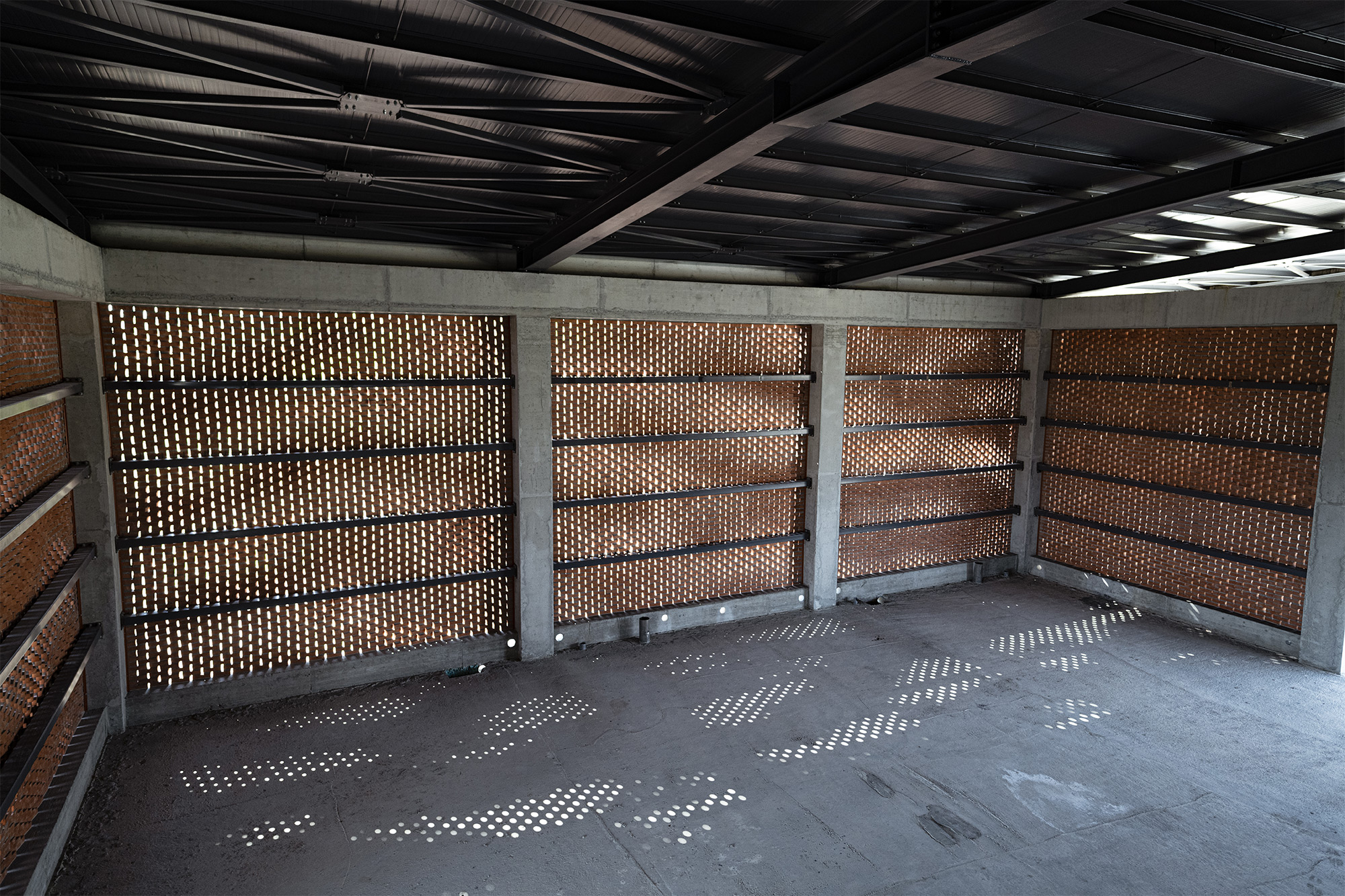 En raison de la construction différente, l’extérieur poreux apparaît comme une vague ou une ondulation. La façade à motifs assure la ventilation et permet à la lumière du soleil de pénétrer dans le bâtiment, ce qui produit un ensemble de cercles qui se déplacent en fonction de l’heure de la journée. Un effet dynamique tout simplement magnifique !