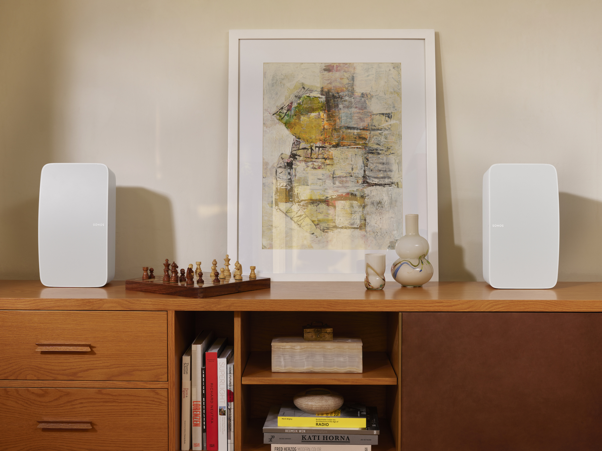 L’enceinte la plus puissante de Sonos pour la musique est mise à jour également. Le Sonos Five fournit le même son remarquable et la même architecture acoustique que le Sonos Play:5 (Gen 2). Comme son prédécesseur, le Sonos Five trouve sa place partout. Utilisez un Sonos Five seul en position horizontale, ou associez-en deux en position verticale pour une séparation stéréo incroyablement détaillée. C’est un choix idéal pour les vinyles si vous utilisez l’entrée auxiliaire pour connecter une platine vinyle à votre système Sonos. Avec un design innovant qui continue à s’adapter parfaitement à n’importe quel espace, le Sonos Five est disponible en noir avec une grille noire et, pour la première fois, en blanc avec une grille blanche. Sonos Five est disponible au prix de 579€.