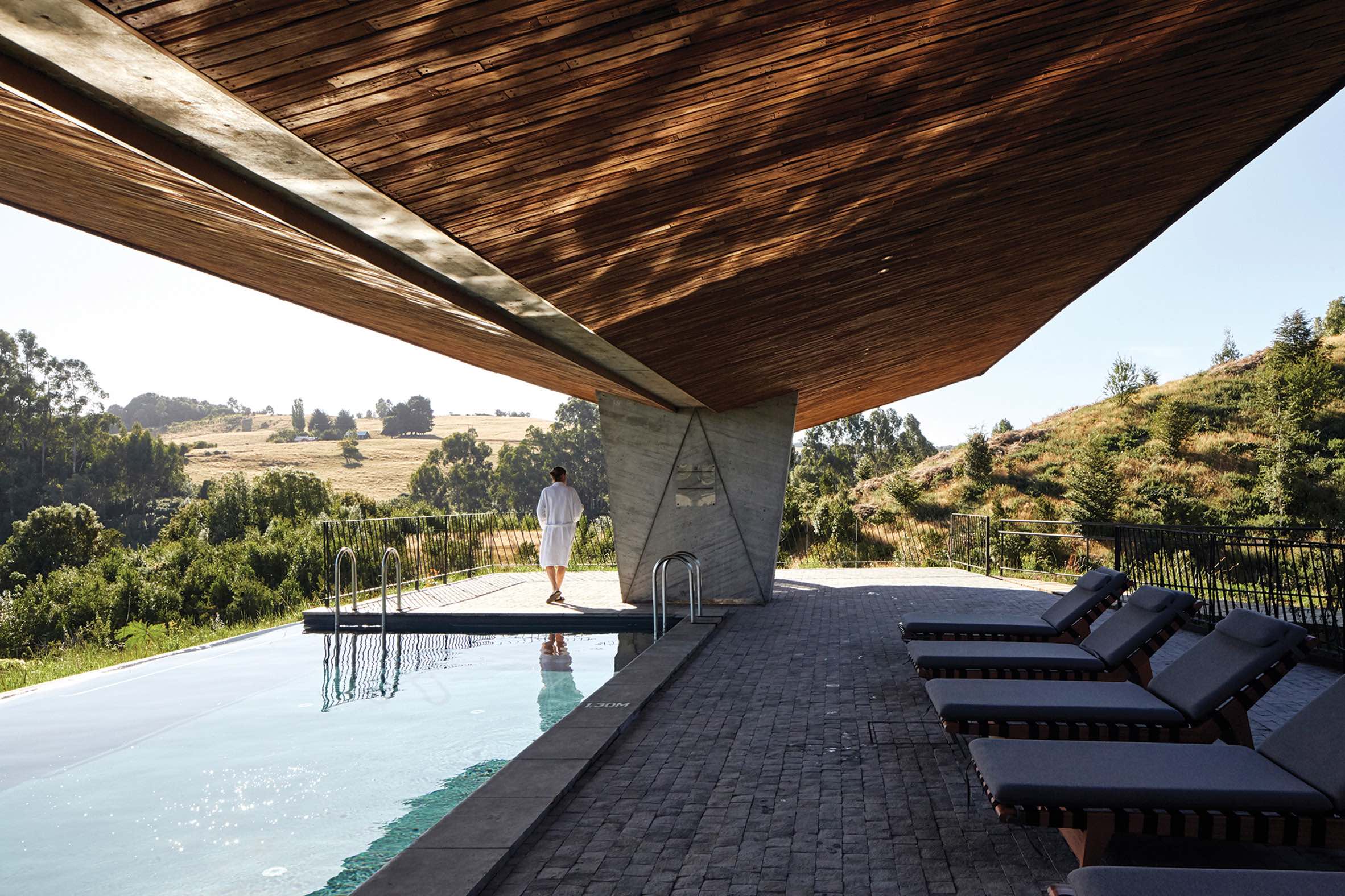 Construit avec une conception géométrique durable, reflétant les «palafitos» traditionnels de l’île (maisons sur pilotis, construites au dessus de la mer), l’hôtel est intime et accueillant. Les intérieurs sont décorés avec soin avec des textiles fabriqués à la main et des sculptures sur bois qui reflètent la culture de l’île. Les vues mêlent une myriade de petites îles et la Cordillère des Andes au loin. L’hôtel compte 12 chambres distinctes, situées à l’étage, pour profiter de la vue et garder les clients connectés au paysage. Chacune d’entre elles a une vue panoramique sur les couleurs changeantes de l’océan. Les espaces communs, comme la piscine, sont situés sous le complexe où ils sont protégés des éléments mais toujours alignés avec des panoramas impressionnants. Les tapis teints à la main et châles tissés avec de la laine locale de moutons, rendent ses espace chauds et confortables.