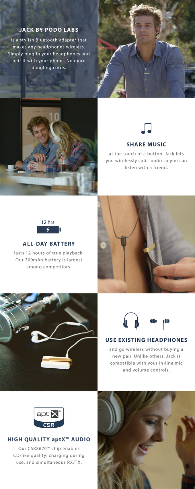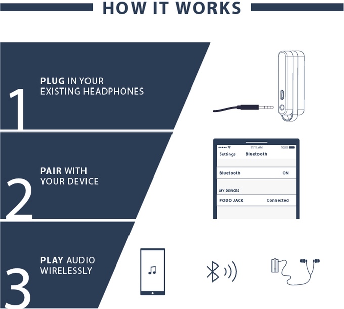 Comme vous pouvez le voir sur la vidéo de présentation Kickstarter, Jack est un minuscule boitier auquel il suffit de pluger vos écouteurs, via une prise jack justement. Jack se synchronise avec votre source audio via bluetooth. Du coup, vous lancez Spotify ou Deezer sur votre téléphone, vous lancez le bluetooth, vous synchronisez votre téléphone avec Jack et le tour est joué. Vous me direz qu’il aurait juste été besoin de brancher directement vos écouteurs à votre téléphone en Jack, mais pensez un peu à ceux qui ont des iPhones 7 ou ceux qui comme moi ont un Jack défaillant à votre de l’utiliser. Et puis, c’est quand même beaucoup plus pratique d’avoir un téléphone dans une poche ou dans un sac, avec le fil des écouteurs sous le tshirt, et alors d’utiliser très librement votre téléphone sans être accrocher à ce fil bien relou quand il veut. Tout ça pour $25, je pense que le prix en vaut la chandelle.
